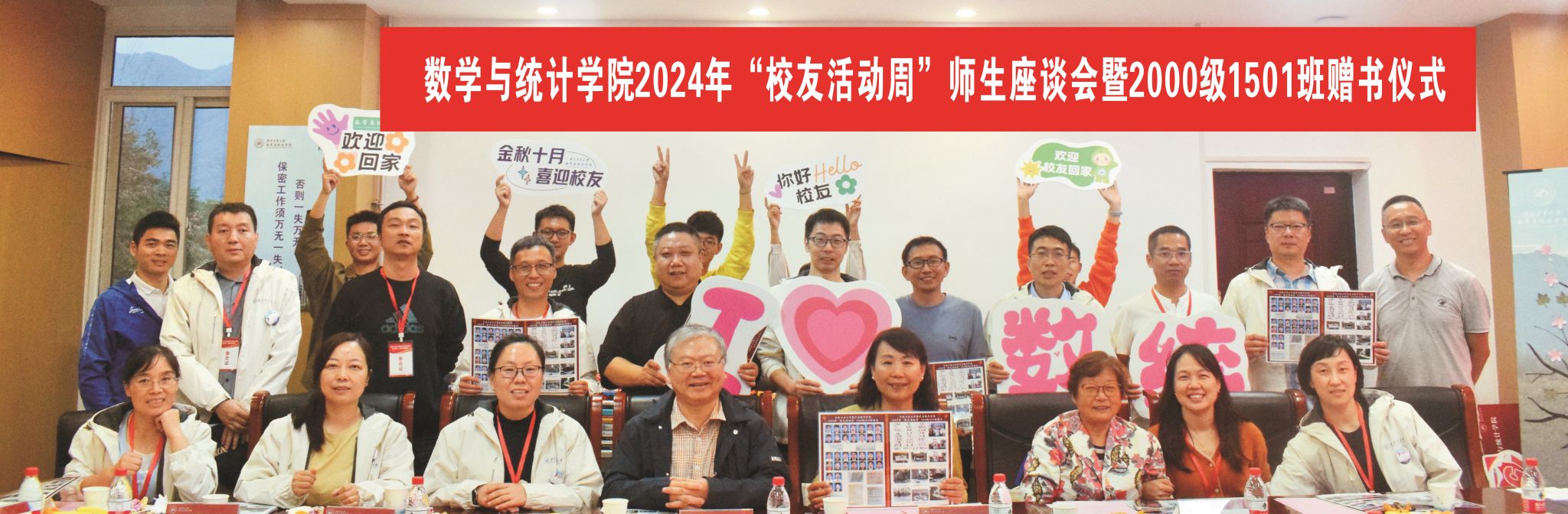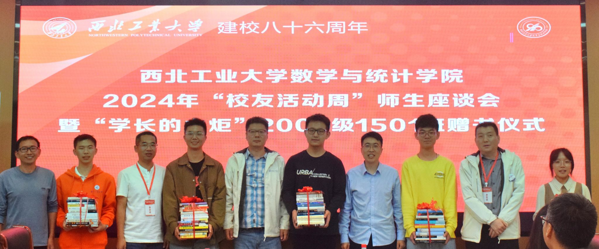 2000级1501班校友代表张共愿在感谢学校、学院悉心栽培的同时,也代表所在班级介绍了延续赠书活动的初衷。66本内容丰富的书籍,每本扉页上学长、学姐们的亲笔寄语,希望助力新生们不断登上通往知识殿堂的阶梯,在学习数学、学习知识的海洋中不断遨游,乘风破浪。学院党委书记王莉代表学院向1501班回赠了34份精心设计,印有当年1501班全体同学毕业时个人照片、签名、学院资深教师寄语以及学校部分老照片的塑封“定制画报”,让校友们在惊喜之余,眼角不时泛出泪光,纷纷表达对学校、学院本次活动细致安排和用心用情的感激。