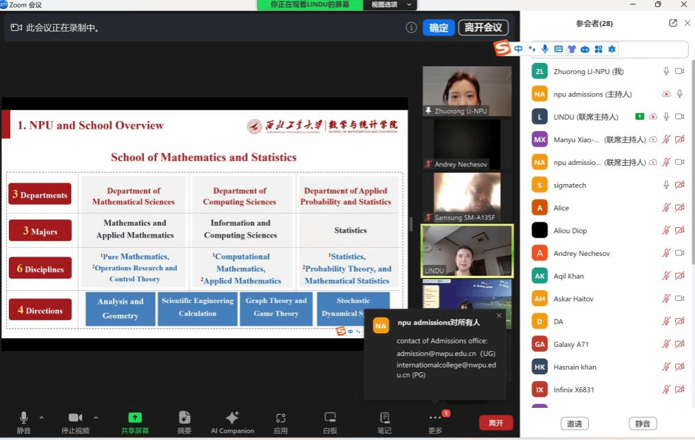 首先,都琳副院长对我校基本信息,我院的院系设置、专业及课程设置、师资力量、国际化教育、人才培养等内容进行了全方位介绍。接下来,肖曼玉主任对学院十大科研团队及其研究方向、导师情况作了详细介绍。杨佳仪老师介绍新生奖学金政策、申请流程和要求,鼓励国际学生在我校深造,提升学历层次。