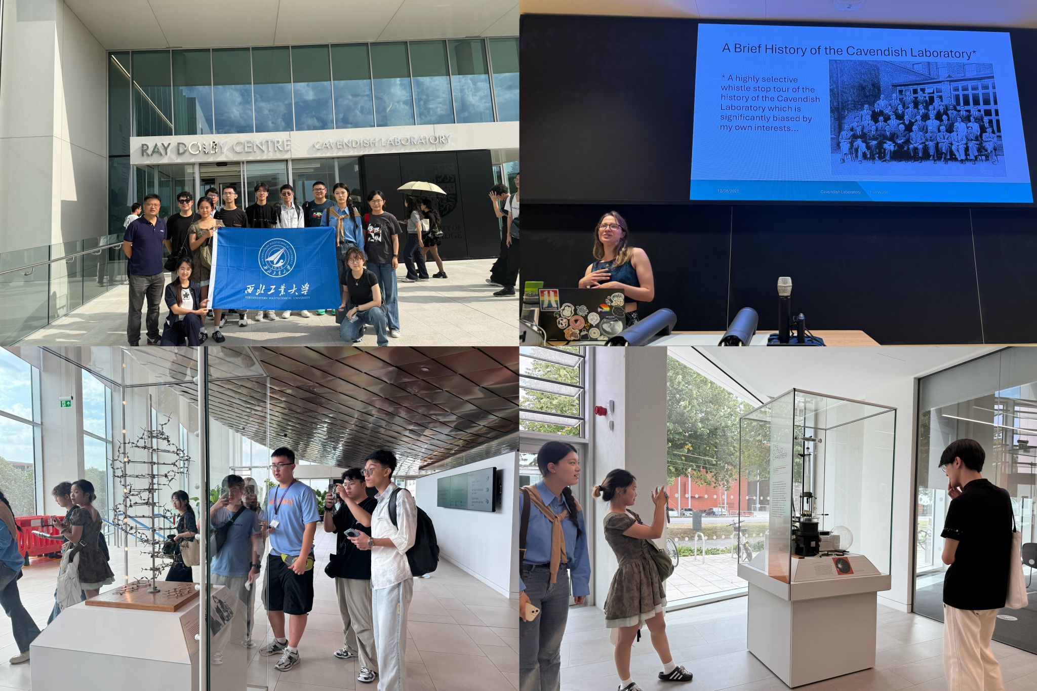 学术探索不仅限于课堂,更延伸至剑桥大学深厚的科研环境与文化场景中。同学们探访了享誉世界的卡文迪许实验室——这座曾走出30余位诺贝尔奖得主的科学圣地。在讲解员的引导下,大家参观了电磁学、核物理等领域的经典实验装置,聆听了关于DNA双螺旋结构发现、电子衍射实验等重大突破的历史解说,深切体会到剑桥“从实验到理论”的严谨科研传统。