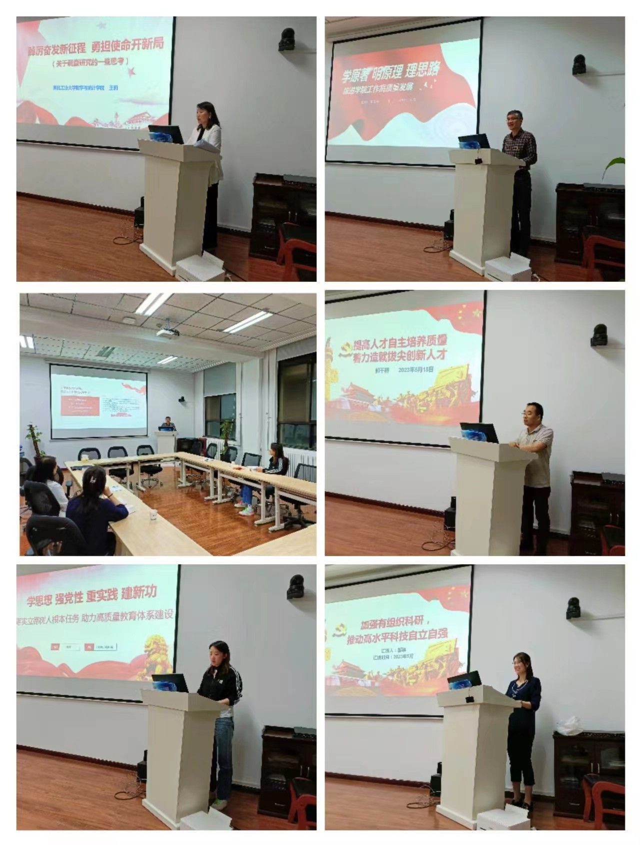 以“学”领航,坚定主题教育思想引领前进方向。学院坚持“两确保”,统筹谋划推进学习活动取得实效。一是紧抓关键环节,确保主题教育入心。学院党委扛稳主体责任,积极落实“第一议题”制度,自4月以来,先后召开4次党委会(扩大)会议、4次党委理论学习中心组(扩大)学习会、全体师生党员大会和师生党支部书记会议传达学习中央、学校主题教育有关精神,研究部署推进主题教育工作。二是创新理论学习,确保主题教育入脑。学院出台主题教育制度文件5份,下发全体党员和青年学生主题教育实施方案,制定详实的理论学习计划,明确必学、自学范围,细化学院党员领导干部和各党支部落实主题教育学习要求,设立理论学习督导,逐级传导压力,层层压实责任,形成了党委引领学、交流研讨学、专题宣讲学、支部集中学、丰富载体学的态势,统一了思想,凝聚了共识,切实增强了开展主题教育的思想自觉政治自觉行动自觉。