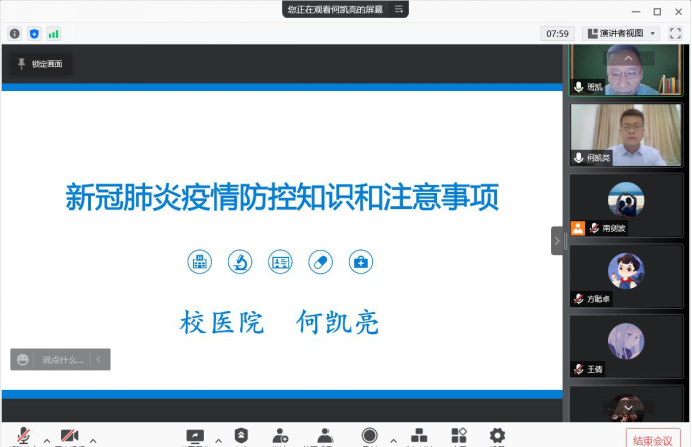 为进一步落实学校疫情防控工作有关文件精神,使学院师生党支部成员在寒假期间都能带头做到科学防控,2022年1月27日,k动漫 办公室党支部经过前期精心策划,邀请校医院何凯亮副院长通过腾讯会议,面向学院理论中心组全体成员,数学科学系党支部、计算科学系党支部、应用概率统计系党支部以及部分学生党支部全体党员共计82人,在线进行新冠肺炎疫情防控知识的宣讲。
