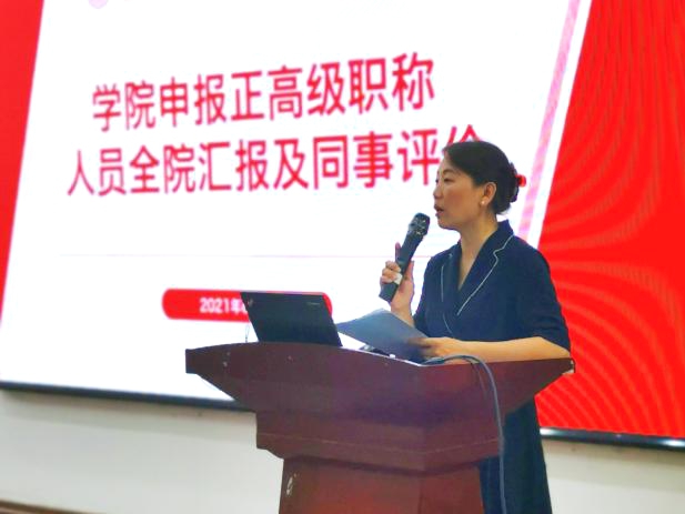 随后,大会进行学院职称评审现场述职和同事评价环节。为促进学院教师互相了解、相互学习、相互启发,强化优秀教师的示范引领作用,学院要求申报正高级职称人员面向全院教职员工进行公开汇报。根据随机抽签顺序,张红慧、王亮、李斌龙、周敏、马荣、潘璐璐六位教师依次从人才培养、科学研究、国际合作、公共服务等方面进行了个人汇报,全院其他教授、副教授现场投票评价。评价结果将作为学院职称评审的重要依据。