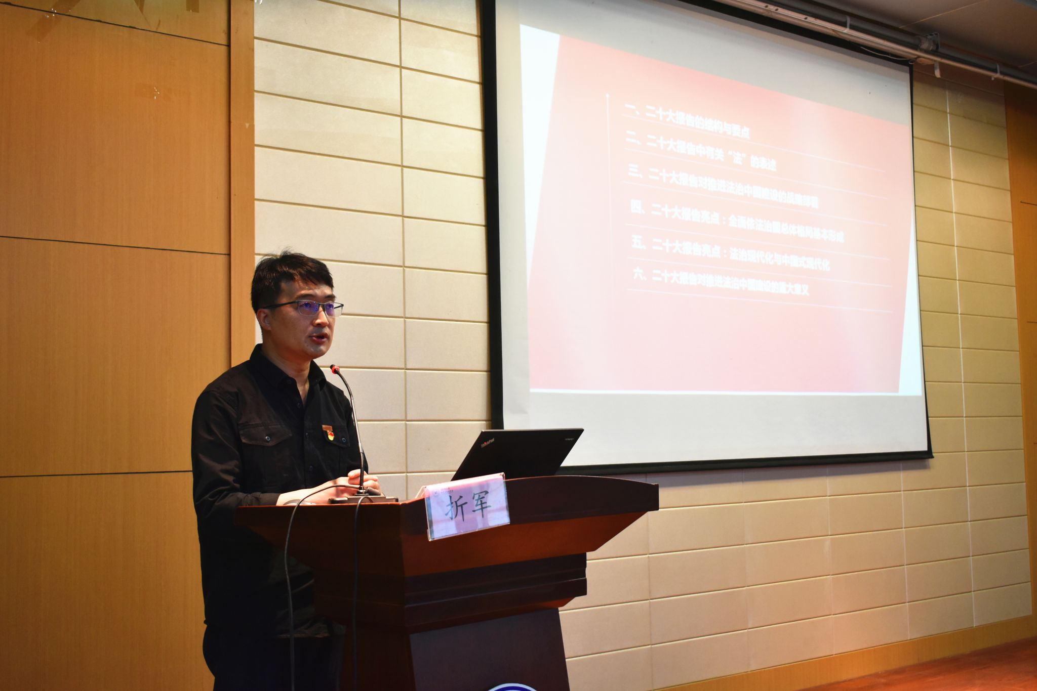 为进一步贯彻落实学校新学期《关于加强党的二十大精神学习宣讲的通知》内容要求,4月25日,k动漫 特邀学校马克思主义学院教师理论宣讲团成员折军于长安校区学院报告厅作了题为《坚持全面依法治国 推进法治中国建设》专题党课。学院领导班子全体成员、全体师生党员共同参会。报告会由学院党委书记王莉主持。