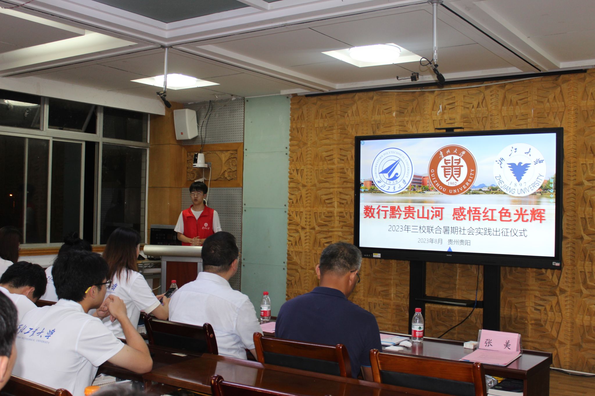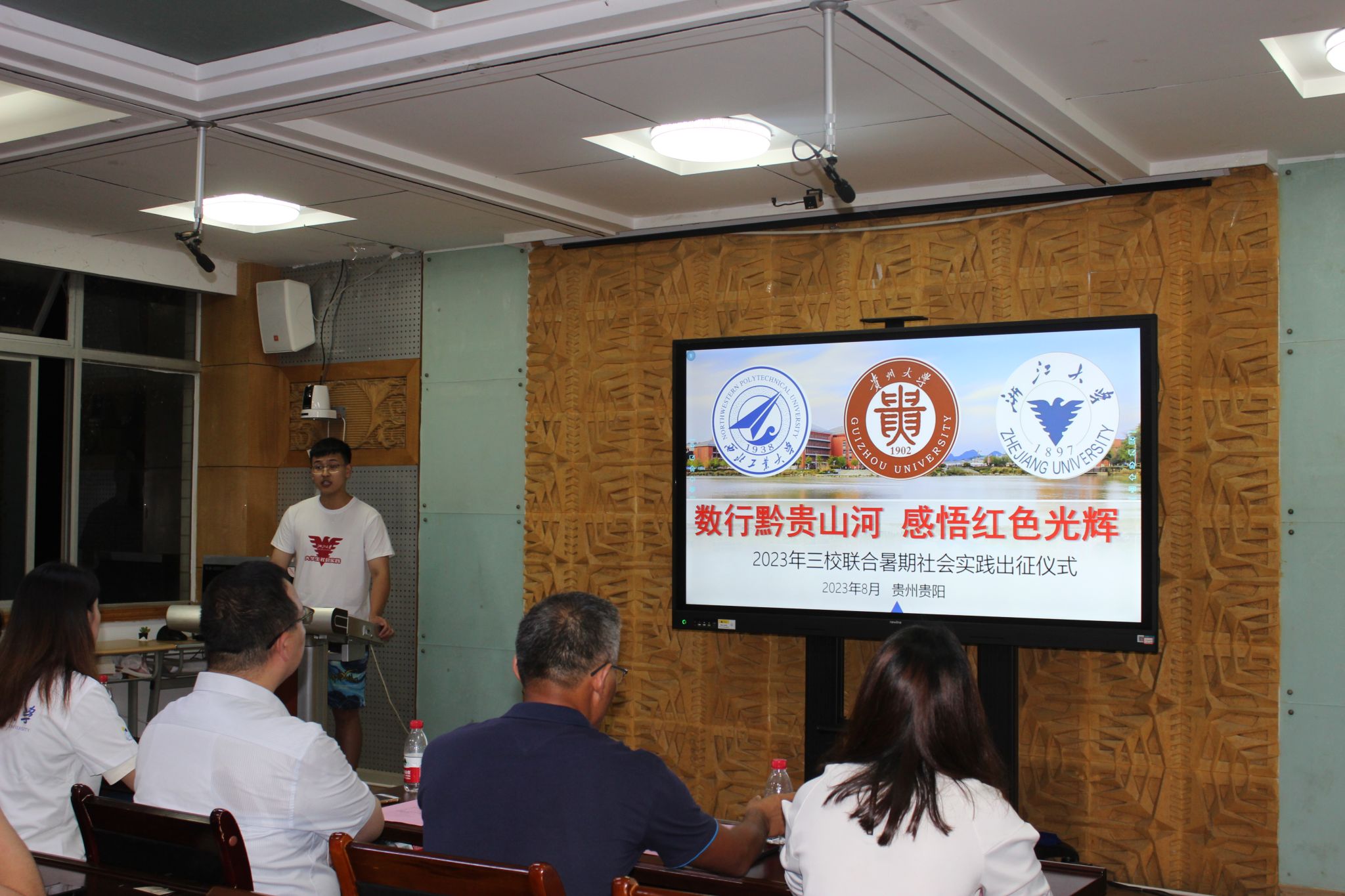 2023年8月5日,k动漫 、贵州大学及浙江大学三校联合社会实践出征仪式在贵州大学东校区博学楼329会议室举行。贵州大学k动漫 院长王锦荣教授、贵州大学学术委员会办公室主任贾平生教授、k动漫 党委副书记张莹教授、k动漫 学校办公室戴卓老师、贵州大学k动漫 辅导员张美老师出席,三校实践队全体成员22人参加。会议由贵州大学k动漫 团委书记高洪老师主持。