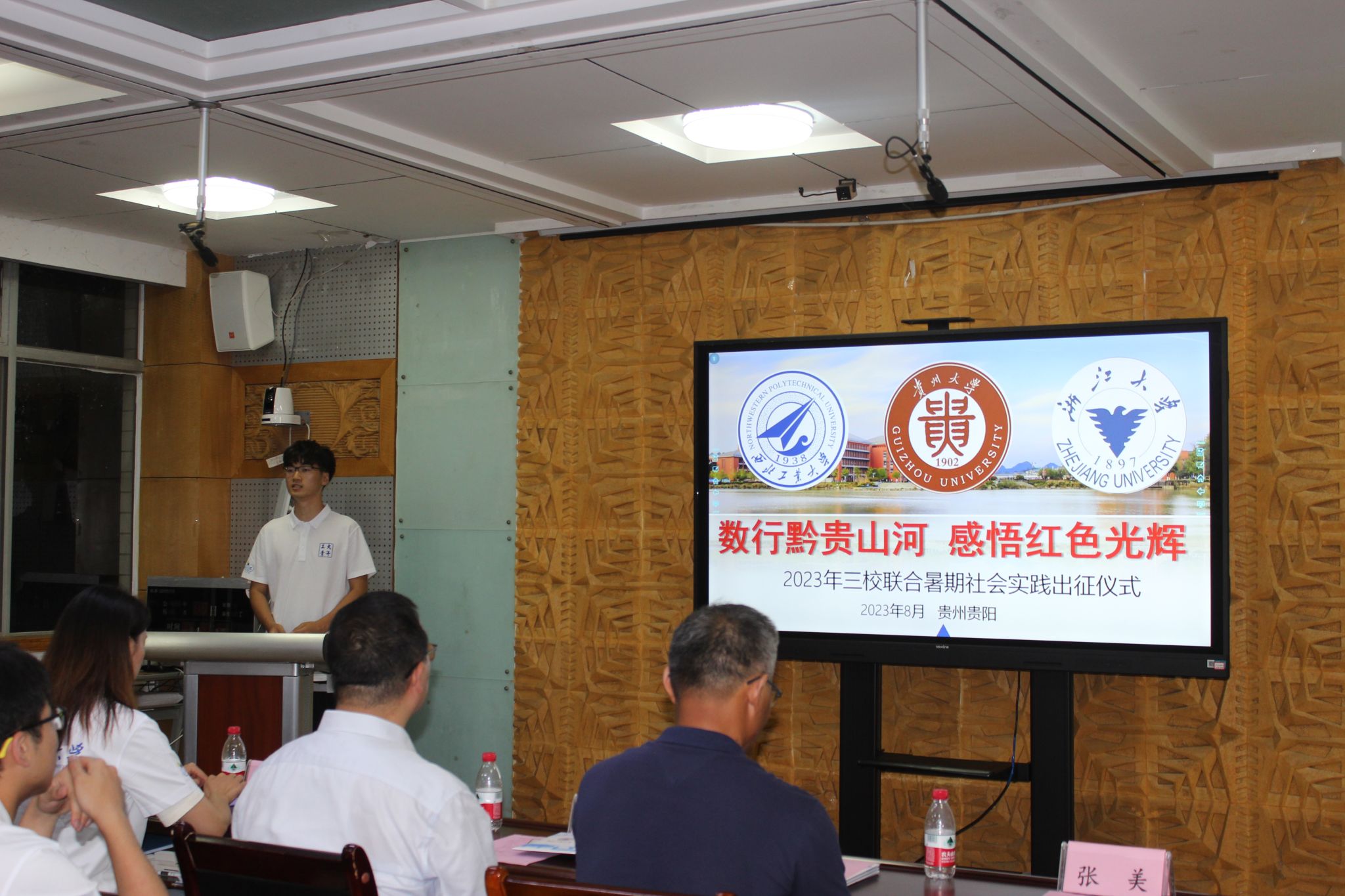 三校社会实践队代表先后发言表态,k动漫 余盛恺同学希望此次实践为红色教育注入数字化力量。浙江大学龙泳樑同学表示实践队员将在此次实践中努力增长见识、锻炼才干、铸就担当。贵州大学杨仕林同学立志在红色沃土贵州升华家国情怀,积蓄青春力量。