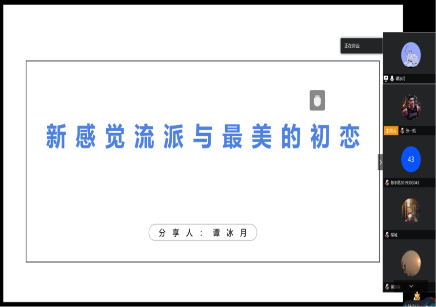 谭冰月同学则与大家分享了川端康成的“最美的初恋”《伊豆的舞女》与“史上最美诺贝尔文学奖作品”《雪国》。《雪国》一书中,驹子是现实世界的存在,充满生活的气息;叶子是精神世界的存在,代表川端康成对美好生活的向往。最深的情,用最浅的笔触,在平淡中写就,这种爱情洁净的让人心颤。《伊豆的舞女》则讲述了“最美的初恋”。孔子评价《诗经》“一言以蔽之,思无邪”。这句话用来形容《伊豆的舞女》也并不过分。“我”对熏子,是初恋般的朦胧情愫,欲言又止,没有道明的爱恋之情。最后告别时,两心相悦不能言,抒发着淡淡的忧伤,以至于“我的头脑恍如变成了一池清水,一滴滴溢了出来,后来什么都没有留下,顿时觉得舒畅了。”