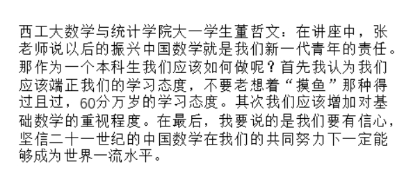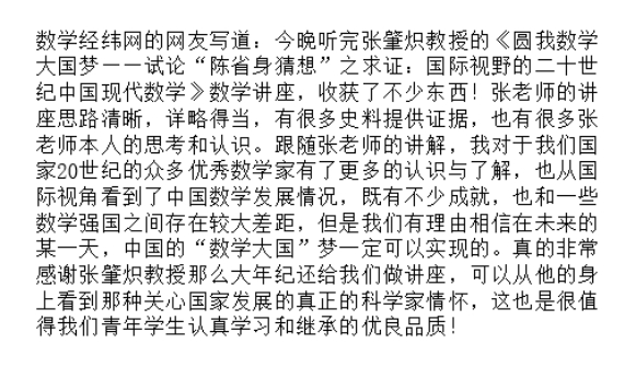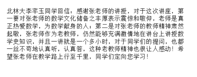 还有网友写道:“张老师,我周围听讲的同学都觉得收获非常大,尤其是您对中国数学的现状以及落后原因的分析,让同学们极大地开阔了视野,跳出对书本的学习,真正去关心我国数学发展的现状”。
