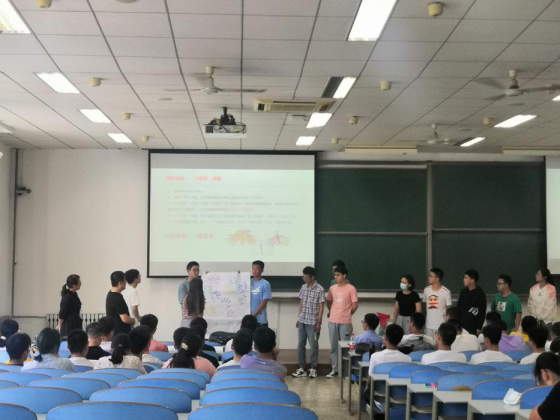 随后,王莉老师带着同学们开展了主题为《以终为始,不负青春,再启新程,载梦起航》的破冰活动。在王老师的组织下,学生们按照班级分成10个小团队,每个团队成员在白纸上画出手印,分别在手印的五指上写上自己的姓名、最突出的性格特点、最感兴趣的事情、最具竞争力的能力、大学里最期待的收获,并在纸上写出团队名称和口号。完成后每个团队依次上台展示。整个过程中大家都非常积极,同学们的欢笑声和掌声不断!展示中看到团队名称各具特色,有的数学味浓厚,有的富有诗意又蕴意不凡,有的紧扣国家对青年的寄托和期许。同学们的讲解也是特点鲜明,有的伴着家乡口音诙谐幽默地讲出,有的像解读一首诗般娓娓道来,充分展现出了我院大一新生的个性和风采!