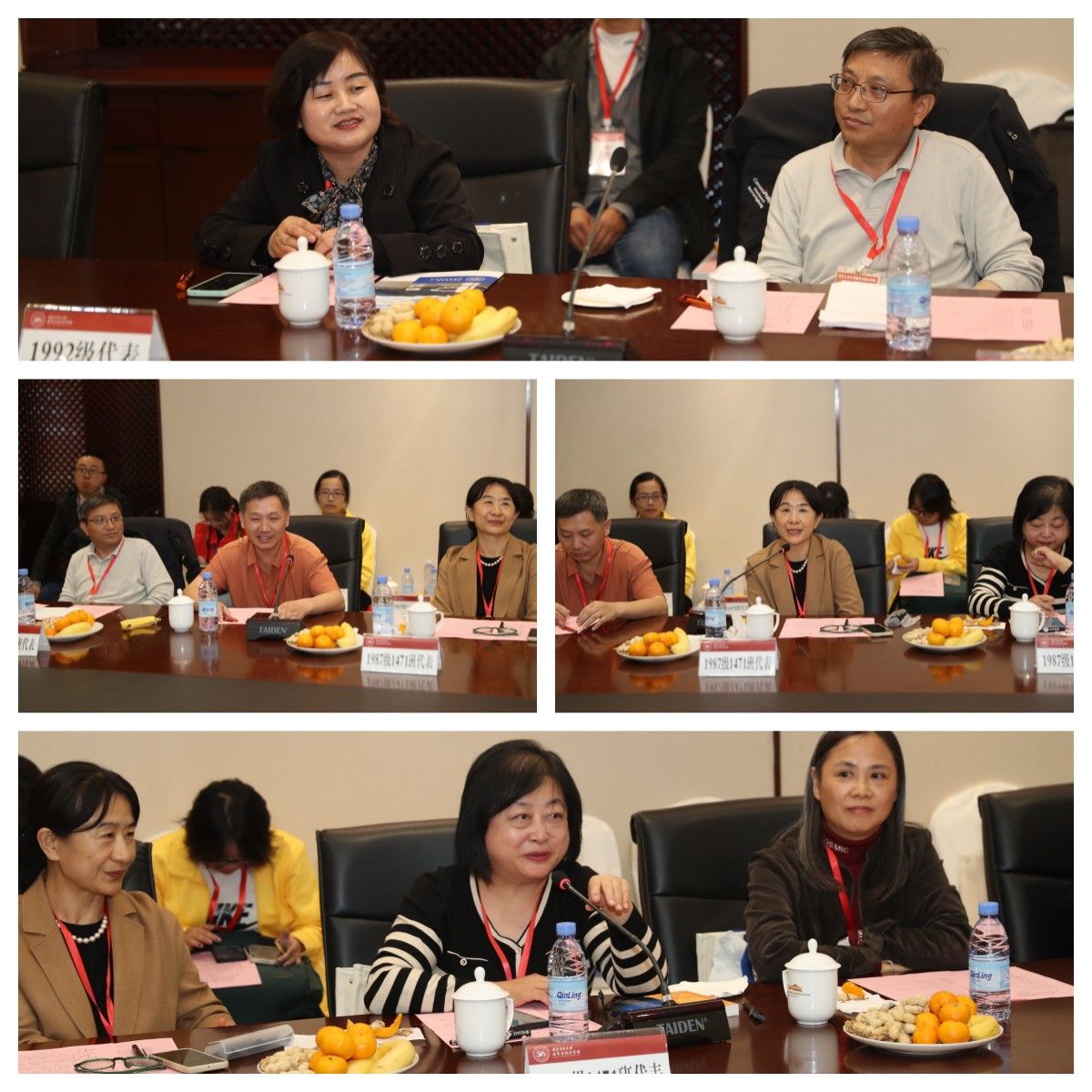 1987级1471班校友代表王永忠在感谢学校、学院悉心栽培的同时,也代表所在班级介绍了本次赠书活动的初衷。110本内容丰富的书籍,每本扉页上学长们的亲笔寄语,不仅希望同学们能静下心来,养成良好的阅读习惯,陶冶情操,而且希望大家能在大学期间能牢记四点嘱托:一是要努力学习,踏实学习;二是要交好朋友,要交有担当责任的朋友;三是要有宽广胸怀,要以真诚善良面对他人;四是不仅要埋头苦干,而且要抬头看路。学院党委书记王莉代表学院向1471班回赠了28份精心设计,印有当年1471班全体同学毕业时个人照片、签名、学院资深教师寄语以及学校部分老照片的塑封画报,瞬间让校友们在惊喜之余,眼角泛出泪水,纷纷表示对学校、学院本次活动的细致服务和周到安排感激万分。