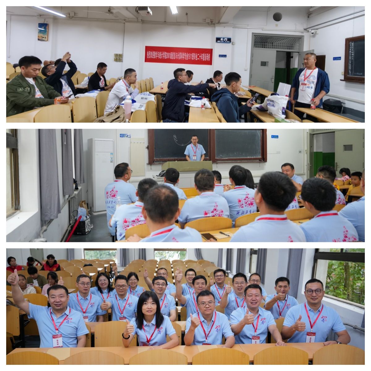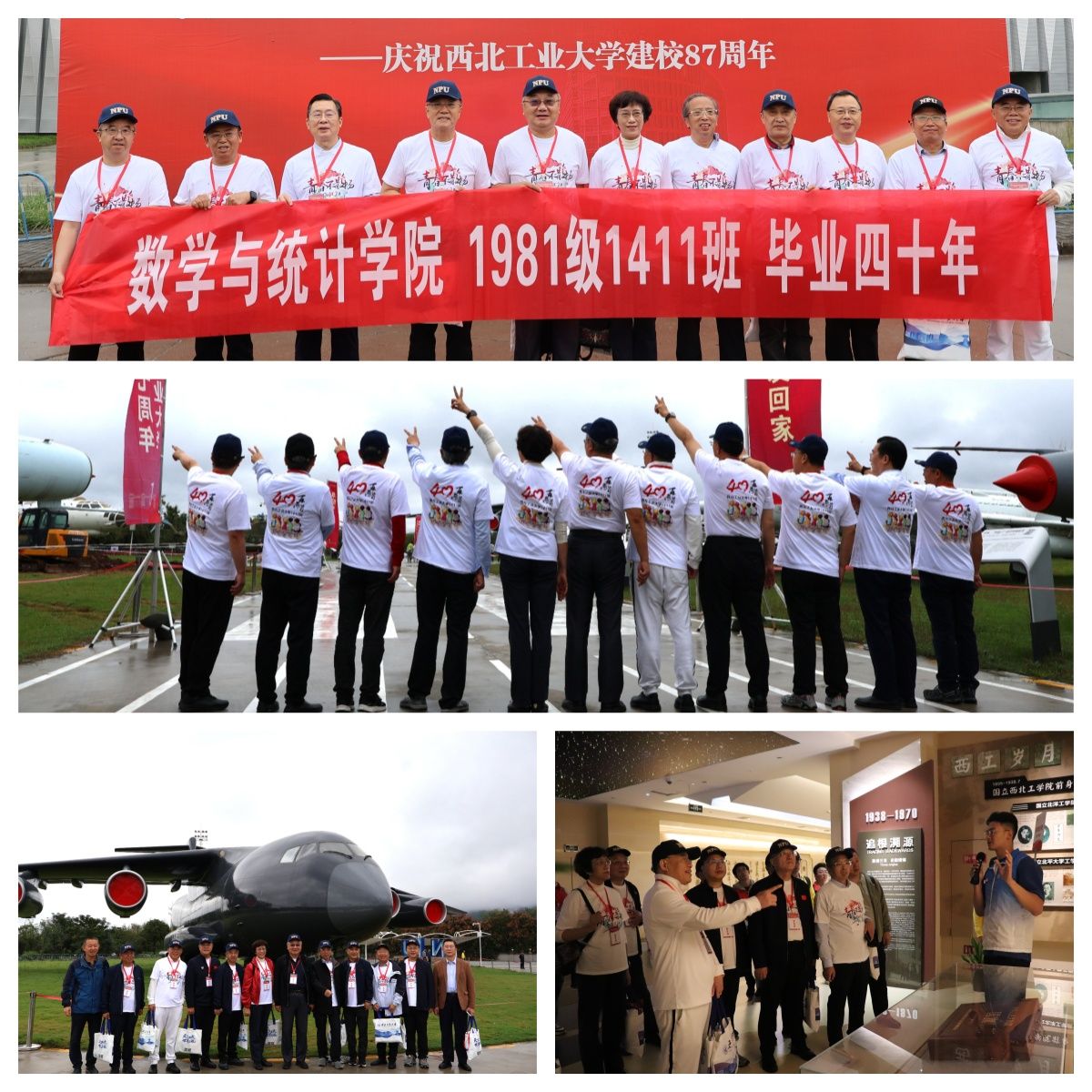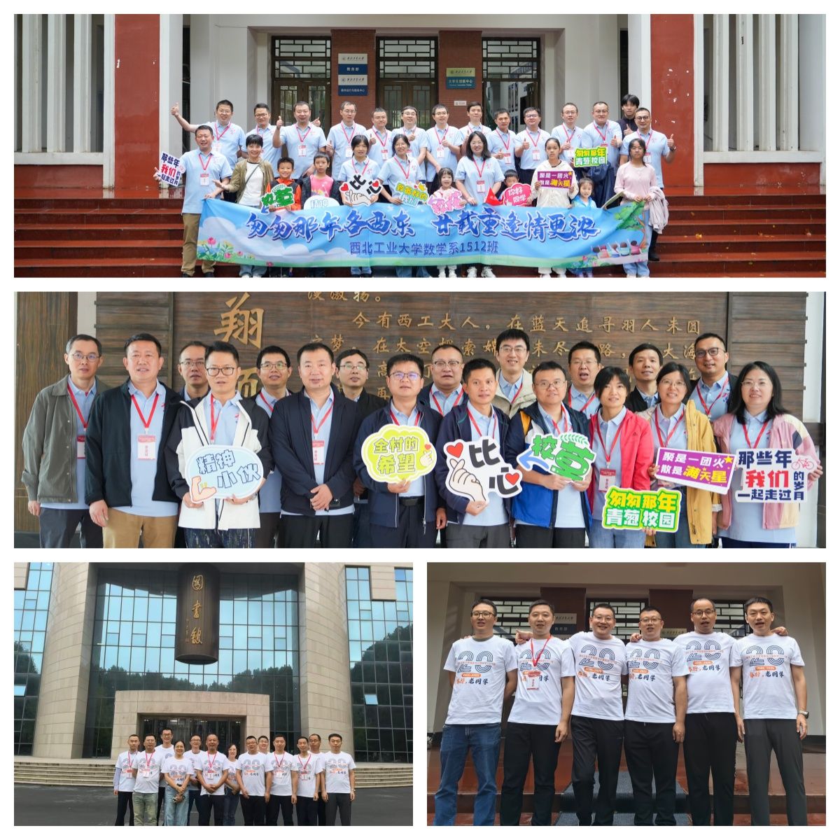 当天早上,在校友会的精心部署安排下,三个返校班级连同家属共计80余人,在学院三组学生志愿者的引导下,上下午分别“重走校园路”。在友谊、长安两校区“公”“诚”“勇”“毅”四大标志性建筑,老校区图书馆,知名“网红”地三航博物馆,“为国铸剑”的何尊广场,新校区“亚洲最大”水上图书馆,饱含底蕴的校史馆等地处处留下校友们意气风发的身影,自豪、温馨、共情……2001级信息与计算科学专业1511班、1512班先后组织的主题班会更是将工大数学人的骄傲洒满整个校园。