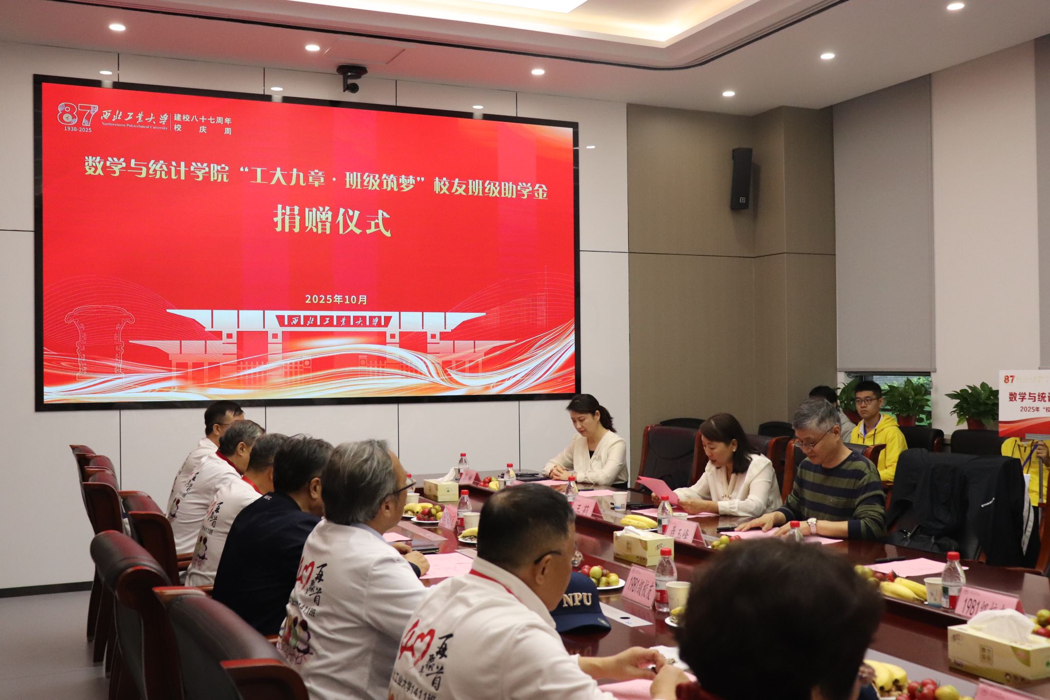在重温毕业午餐后,1981级应用数学专业1411班在海天苑大楼k动漫 会议室组织的“工大九章·班级筑梦”校友班级助学金捐赠仪式,再次将本次系列活动推上高潮。仪式上,学院党委书记王莉、院长聂玉峰、对外联络办公室副主任苟兴旺先后代表学校、学院对校友们回家表示热烈欢迎,对校友们此次捐赠的善意善举表示感谢。校友王命宇代表班级签约,并表示希望西工大的这种传承精神能够不断延续下去、使更多的学弟学妹们在温暖的校园中茁壮成长。苟兴旺老师也动情地表示热烈欢迎各位校友常回家看看,母校永远是大家的坚强后盾。