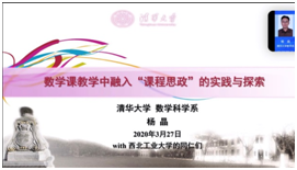 为提高学院教师的课程思政意识,实现数学课程与思政课程同向同行,形成协同效应,k动漫 于3月27日下午3点通过zoom视频会议,举办了第二期启翔数苑教学研究沙龙活动。本次沙龙活动主题为“立德树人,润物无声,大学数学课程思政之我见”,特邀清华大学数学科学系杨晶副教授,针对数学课教学中融入“课程思政”的实践与探索的经验和体会进行了分享,并就教师如何结合新兴教育技术和在线教学方法,把思政教育贯穿大学数学课程教学全过程,坚持立德树人展开交流和讨论。理学学院联合党委杨铭书记、张莹副书记,k动漫 都琳副院长、徐根玖副院长参加了此次沙龙活动,沙龙由k动漫 副院长都琳主持。k动漫 、西安电子科技大学以及西安邮电大学的30余位教师参加了此次沙龙活动。