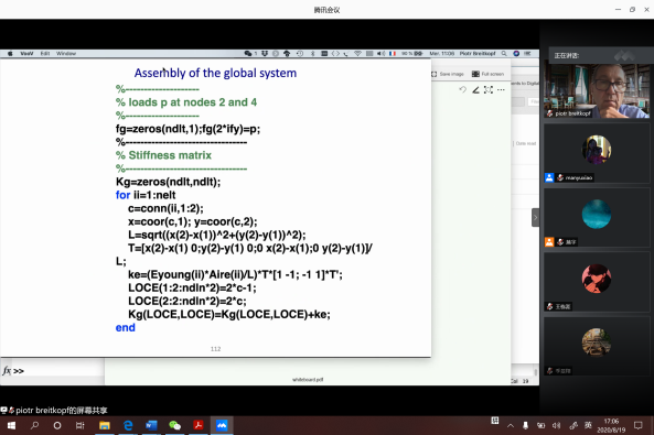 Piotr Breitkopf教授讲课认真严谨又不失风趣,从弹性力学基本知识,到桁架/连续体有限元分析、再到静/动力学有限元分析,再到结构静/动力学拓扑优化设计的详细讲解,开拓了学生们的视野,使得学生对此领域有了基本的认识。Piotr Breitkopf老师授课期间,经常与学生问答互动,并采取白板书写、线上运行程序等方式,激发了学生们的学习兴趣和激情。无论是从授课方式,还是从授课效果,Piotr Breitkopf老师都受到了学生们的喜欢。通过这门课程的学习,学生们对弹性力学基本知识、静/动力学有限元分析的基本思想、静/动力学拓扑优化设计的基本步骤都有了非常清晰的认识,收获颇丰。非常期待能听到Piotr知名专家后续科研专题讲座。