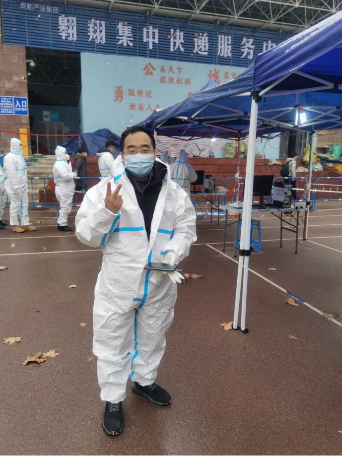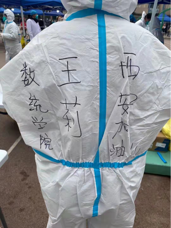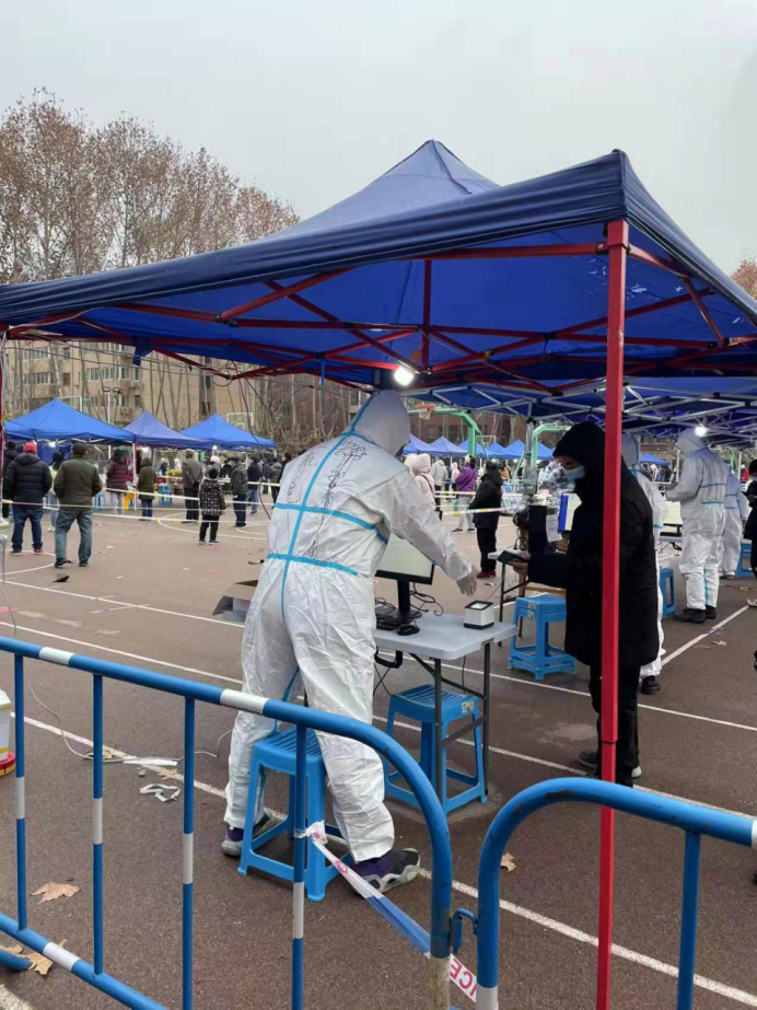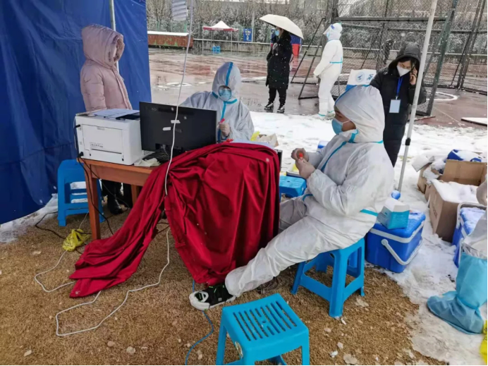 在友谊、长安校区的核酸检测工作现场,身穿“大白”防护服,负责为师生核对身份,检验西安“一码通”的是党委书记王莉、院长助理郭千桥、班凯、青年教师潘璐璐还有学生志愿者王彬、袁昊、王璎斐,几天的分批次工作下来,细心、严谨、寒冷是大家最大的感受,特别是长安校区的风雪天,更是让工作者印象深刻,用心地付出也势必会为全校师生们的健康编制好一面“安全网”。