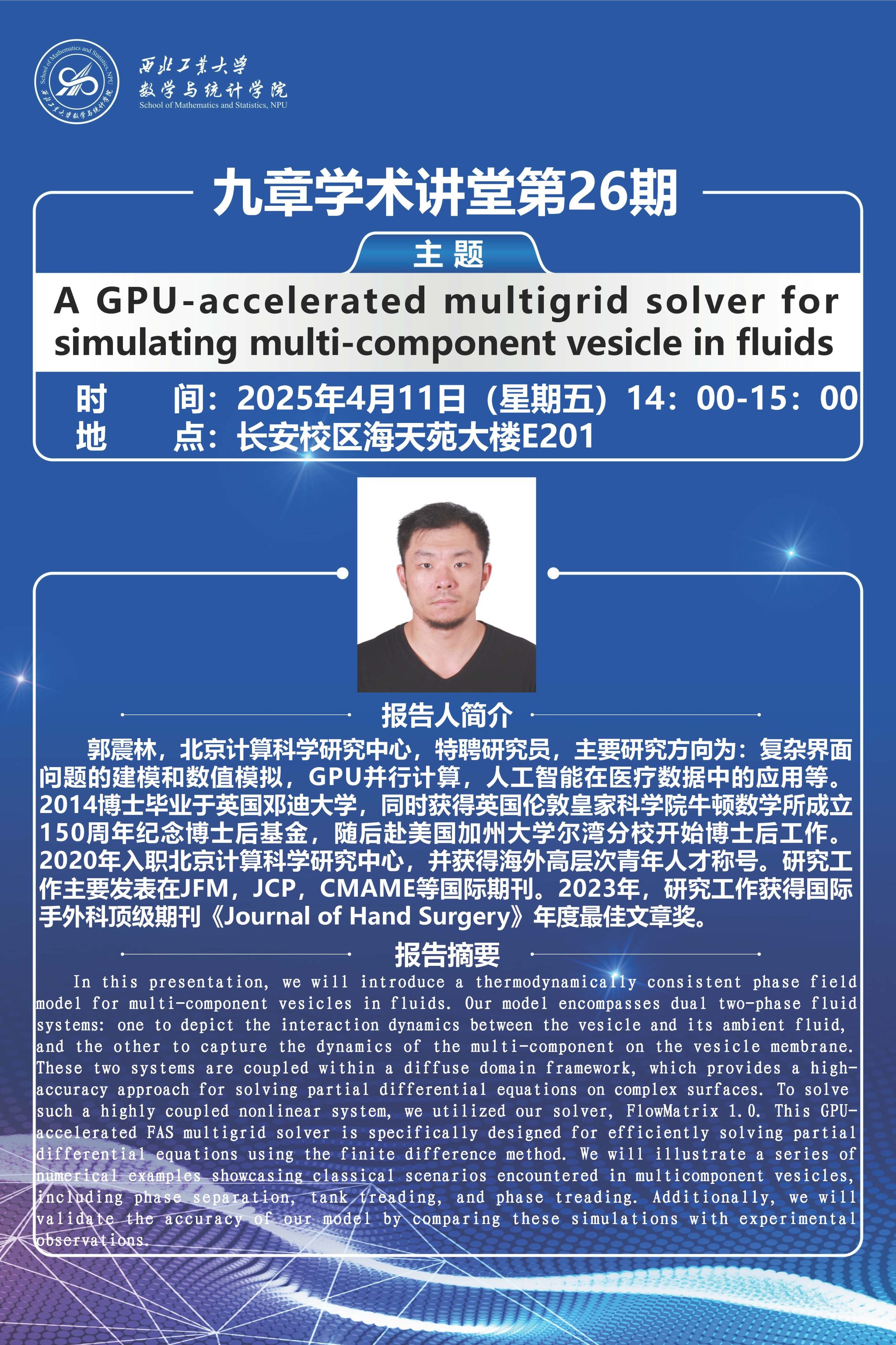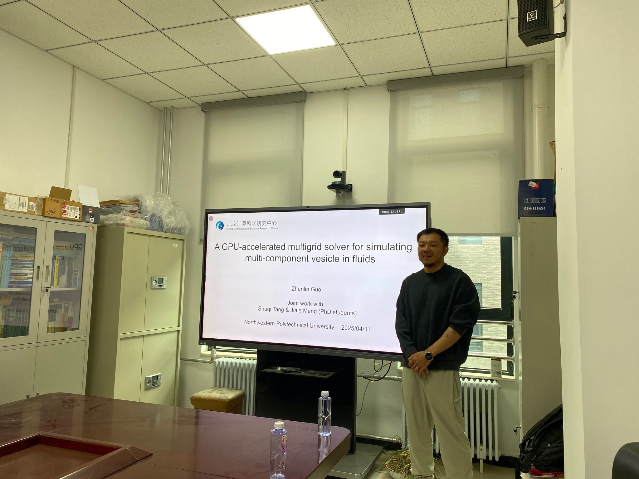 2025年4月11日,北京计算科学研究中心郭震林研究员受邀做客第26期九章学术讲堂,为我院师生作了题为《A GPU-accelerated multigrid solver forsimulating multi-component vesicle in fluids》的精彩学术报告。报告在长安校区海天苑大楼E201举行,教育实验学院/未来技术学院副院长蔡力教授、k动漫 王振海副教授等近30名师生参加了报告会。报告会由荆菲菲副教授主持。