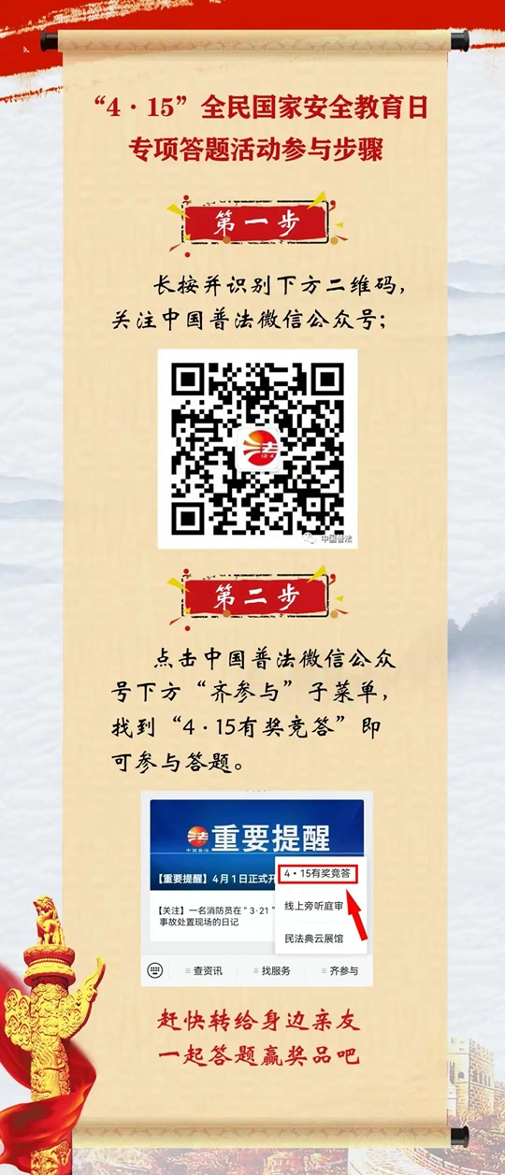 为推动国家安全法治宣传教育工作深入开展,增强全民国家安全意识和法治意识,中国普法微信公众号将于4月1日至30日举办“4•15”全民国家安全教育日专项答题活动,老师和同学们可以通过以下方式参与答题活动。