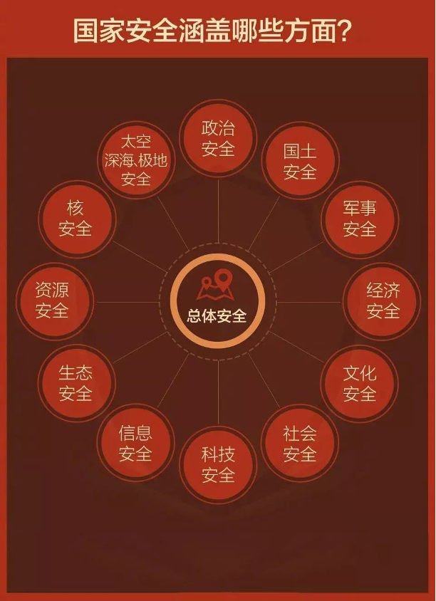 国家安全主要包括政治安全、国土安全、军事安全、经济安全、文化安全、社会安全、科技安全、网络安全、生态安全、资源安全、核安全、海外利益安全、极地安全、太空安全、深海安全和生物安全等16个领域。
