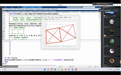 Piotr Breitkopf教授此外还介绍了三维桁架结构拓扑优化方法,内容包括结构离散、单元/节点编号、荷载及边界条件的施加、拓扑优化迭代求解、不同输入参数对拓扑结构的影响、位移应力应变柔顺度分析等。经典99行、88行Matlab代码进行了基于SIMP方法的结构拓扑优化问题的编程实现。