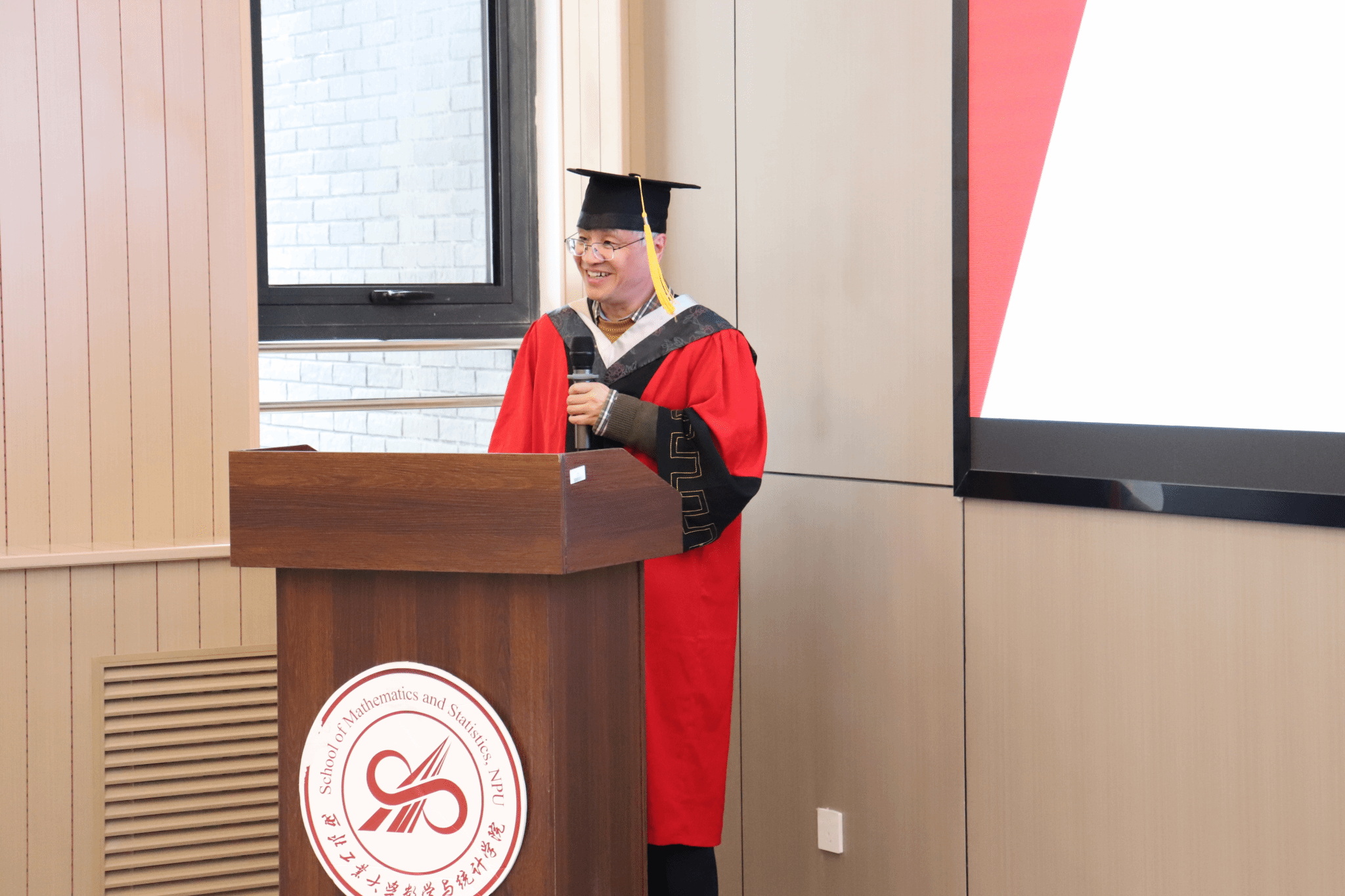 伴随着庄严的国歌,毕业典礼正式拉开帷幕。聂玉峰院长首先为典礼致辞,代表学院向94名顺利完成学业的毕业研究生(87名硕士研究生、7名博士研究生)致以热烈祝贺,向悉心指导学生的导师、默默支持的学生家人以及为学院发展和学生成长付出努力的全体教职员工表达诚挚感谢。他表示,学院见证了同学们在求学路上的拼搏与成长,大家以扎实的专业知识、创新的学术思维为学院争得诸多荣誉。聂院长结合数学与统计学的学科价值,指出其在人工智能、航空航天、国防科技等领域的重要支撑作用,并向同学们提出三点嘱托:坚守初心保持求知热忱,以专业之力追求卓越;勇担使命践行家国情怀,将个人理想融入国家发展大局;心怀温暖坚守人生底色,在追求事业的同时珍惜亲情友情、热爱生活。他寄语同学们,毕业是新的开始,愿大家带着在西工大的收获逐梦前行,常回母校看看。