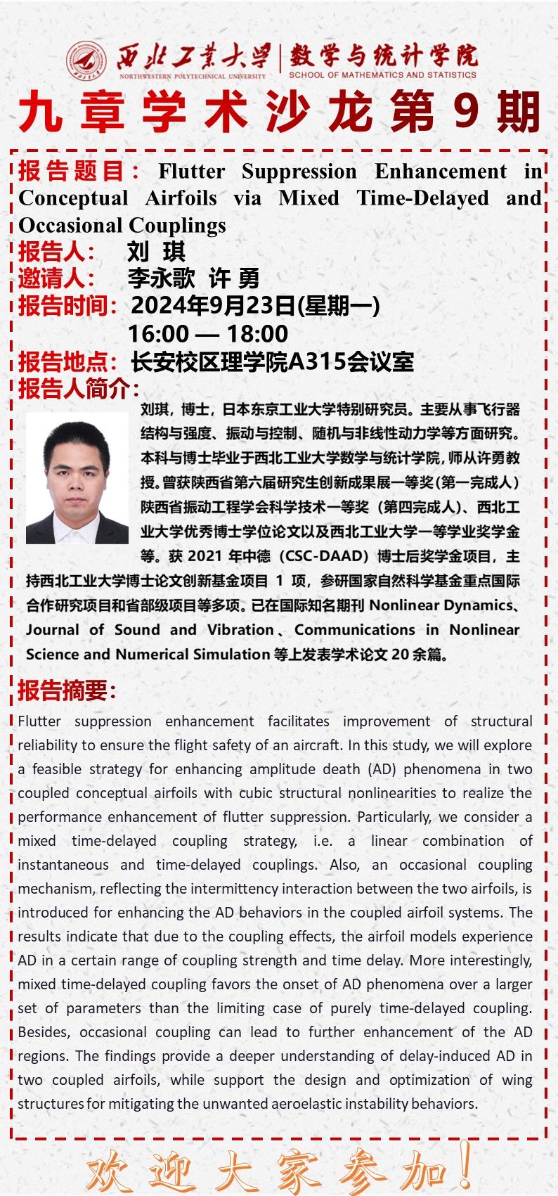 【九章学术沙龙第9期】Flutter Suppression Enhancement in Conceptual Airfoils via Mixed Time-Delayed and Occasional Couplings