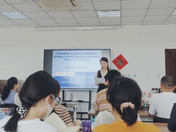 在这次报告中,Jürgen Kurths教授首先对复杂系统科学的发展历程进行了简单的介绍,阐述了一些著名数学问题及相关研究进展,提出了基于递归方法的基本思想及应用,包括庞加莱定理、洛伦兹混沌系统和随机气候模型等,并介绍了一些突出的实际成果,最后强调了复杂系统科学发展中存在的一些问题并与参会的老师同学针对所研究的内容展开激烈的交流与讨论。