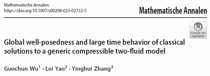 近日,k动漫 分析与几何研究团队姚磊教授与华侨大学吴国春副教授、广西师范大学张映辉教授合作,在等压力的可压缩非守恒两相流模型柯西问题的适定性研究方面取得突破,研究结果“Global well-posedness and large time behavior of classical solutions to a generic compressible two-fluid model”在数学综合顶级期刊Mathematische Annalen 上在线发表(论文链接://link.springer.com/article/10.1007/s00208-023-02732-5),这是我校首次在该顶级期刊发文。