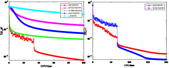 本工作打破现有随机交替方向法的设计思路,仅把光滑子问题的求解放在一个内循环中,发展了一种理论上收敛的非精确加速随机交替方向法(简称AS-ADMM)。具体而言,针对一类含有限和目标的可分离凸优化模型,设计了一种基于小批量样本和动量加速技术的AS-ADMM。随后,将该方法推广至带较大学习率的对称AS-ADMM(简称SAS-ADMM)以及局部并行(或串行)求解的多分块AS-ADMM。利用变分不等式框架,系统建立了算法在期望意义下的次线性收敛速度理论。特别的,在强凸假设下还建立了算法关于迭代点列的线性收敛速度理论。最后,通过调用LIBSVM网站上的公开数据集验证了所提算法求解监督学习问题的高效性,部分对比实验结果如下图所示。