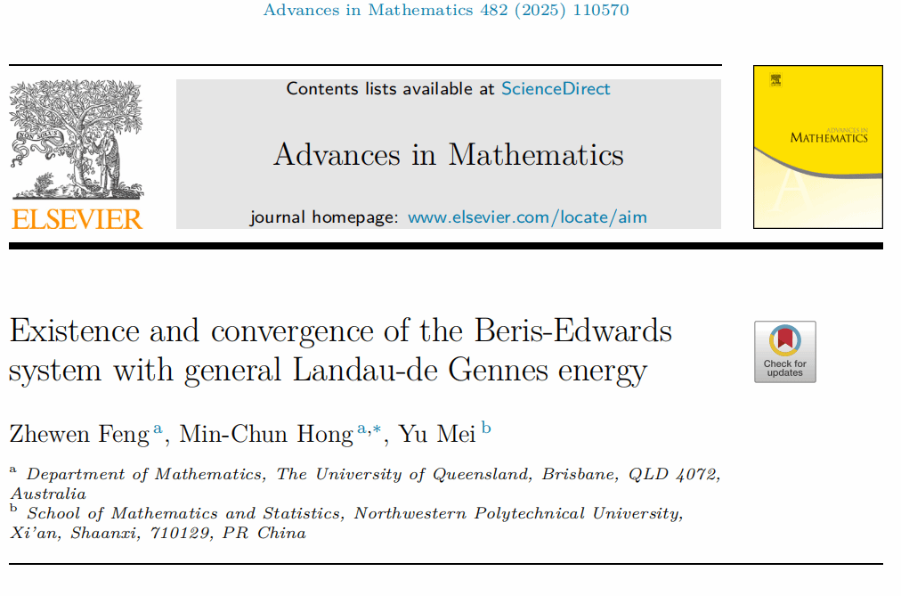 近日,k动漫 梅钰副教授与澳大利亚昆士兰大学冯哲文博士、洪敏纯教授合作,在液晶流Beris-Edwards系统强解的存在性与收敛性方面取得重要进展。研究成果形成79页论文“Existence and convergence of the Beris-Edwards system with general Landau-de Gennes energy”在数学综合期刊《Advances in Mathematics》上在线发表。按国际惯例,论文作者依姓名字母顺序排列。
