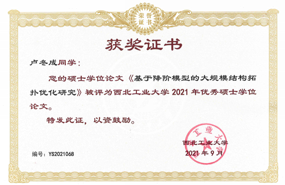 个人简介:卢冬成,男,计算数学专业,师从肖曼玉副教授,研究方向为基于缩减模型的大规模结构拓扑优化,致力于解决拓扑优化设计自由度大、效率低的重难点问题。硕士学习期间,参与国家自然科学基金、中央高校基金、省基金等多个项目,主持并完成k动漫 研究生创意创新种子基金项目1项,积极参与多项重大基金和项目以及国内外学术会议,共发表3篇高水平学术论文,为大规模拓扑优化的学术研究和工程应用提供了一定参考价值。荣获硕士研究生国家奖学金等多个奖项,并荣获2021年优秀毕业生称号。