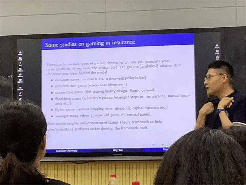 姚经主要介绍了具有时间一致性的再保险投资博弈模型,利用随机控制理论,建立扩展的汉密尔顿-雅各比-贝尔曼方程,通过纳什均衡理论求解博弈均衡策略,借助M矩阵表示方法,给出均衡策略的显性表示形式。此外,姚经还分享了保险研究领域中常见的博弈问题,与参会师生进行了深入的交流与探讨。