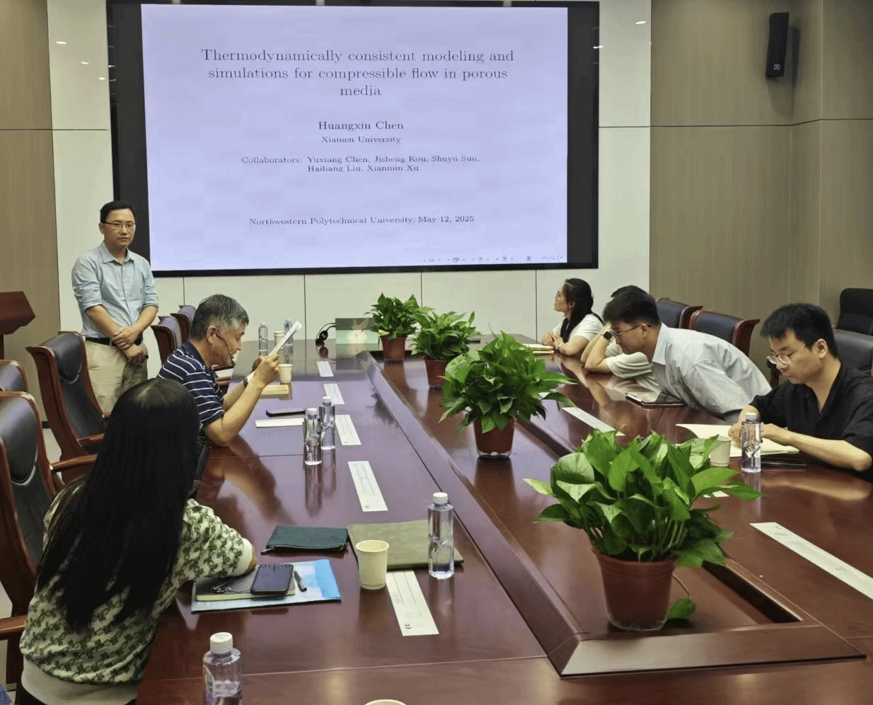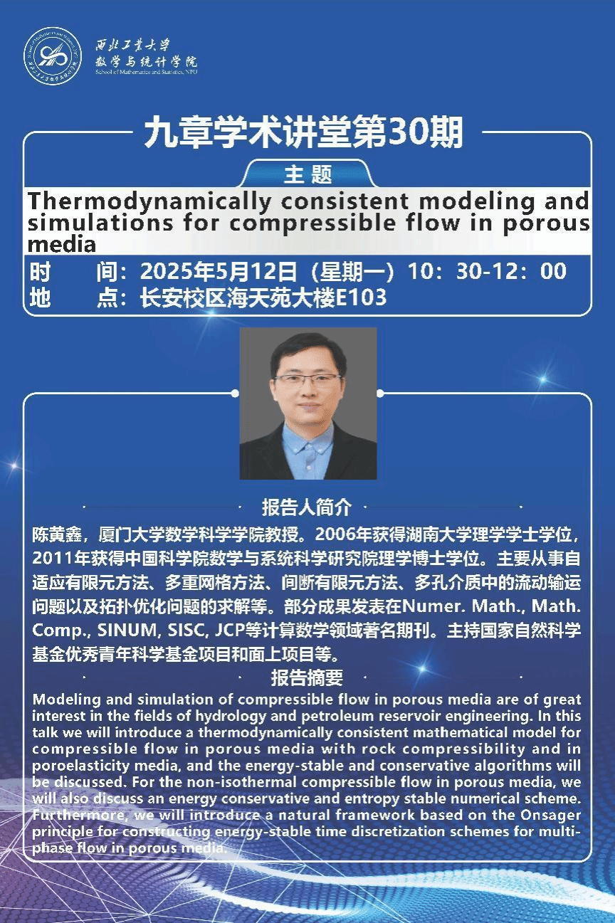 2025年5月12日,k动漫 邀请厦门大学陈黄鑫教授做客“九章学术讲堂”第30期,为我校师生作了题为《Thermodynamically consistent modeling and simulations for compressible flow in porous media》的精彩学术报告。报告在长安校区海天苑大楼E103会议室举行,k动漫 聂玉峰教授、杨宗泽教授等近30名师生参加了报告会,报告会由聂玉峰主持。