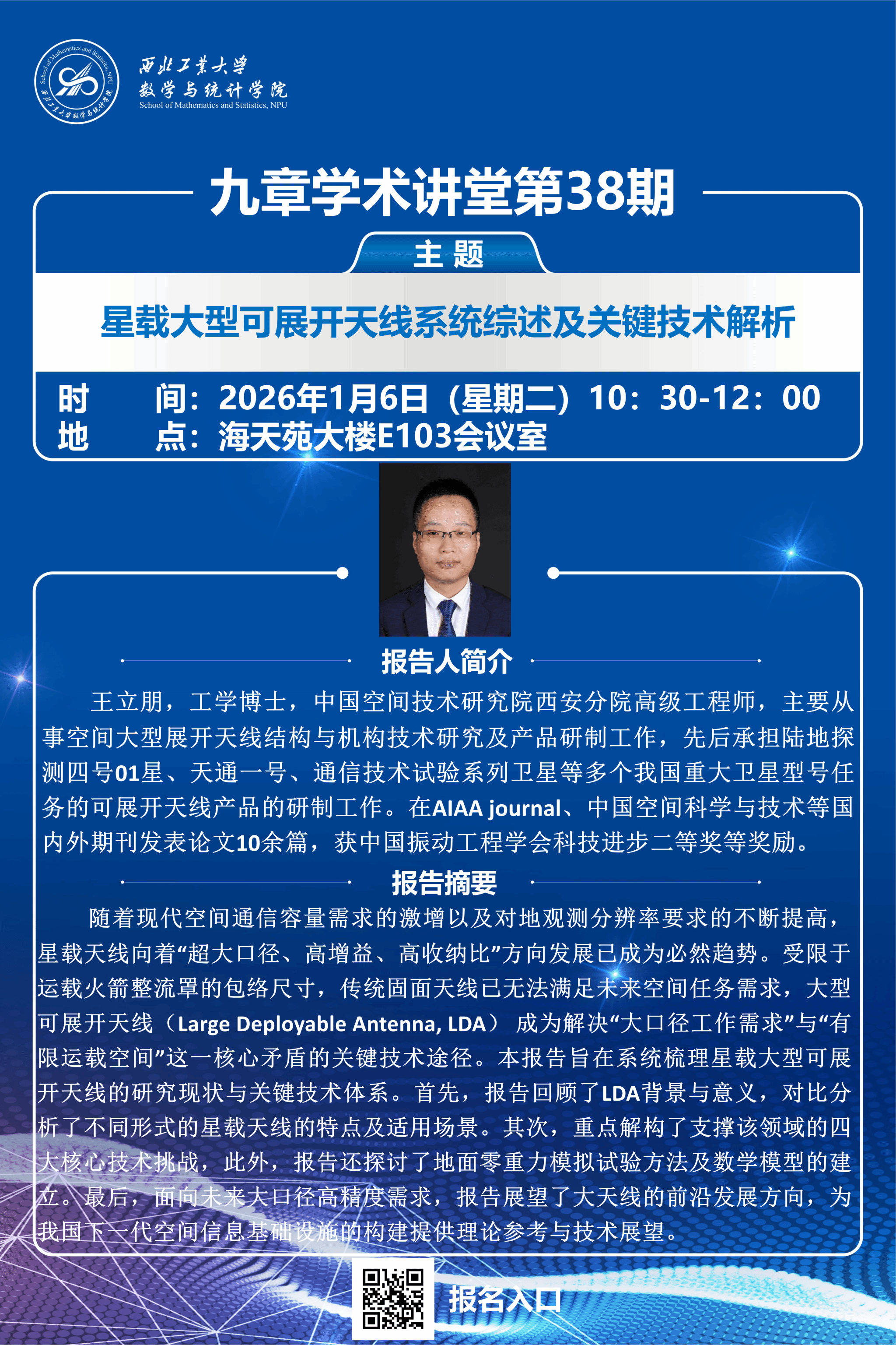 2026年1月6日上午,k动漫 第38期“九章学术讲堂”在海天苑大楼E103会议室成功举办。本期讲堂特邀中国空间技术研究院西安分院高级工程师、工学博士王立朋担任主讲,以“星载大型可展开天线系统综述及关键技术解析”为主题,为k动漫 相关专业师生带来一场聚焦航天工程前沿的深度分享。