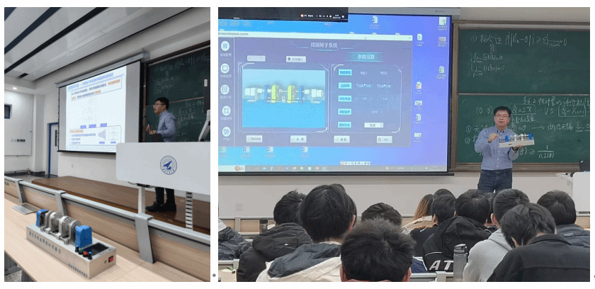 此外,李永波副教授为大家展示了其自主研发的转子系统故障模拟试验台和故障仿真试验台,并与同学们展开深入的交流与讨论。通过在仿真环境中设定不同的故障参数和条件,观察转子系统在这些条件下的运行情况,可以动态演示转子系统的故障诊断,更好地展示转子系统碰磨故障的形成机制、传播路径及影响。同时,采集装置信号数据,运用概率统计方法进行理论分析和故障诊断,通过实验和仿真的结果验证了理论模型的准确性和可靠性。这样的仿真演示生动形象,帮助同学们深刻理解了转子系统的故障检测与诊断技术的原理,大家表示,李老师将复杂的航空发动机转子系统故障问题转化为数学模型和符号化的方式进行分析解决,深入浅出,展现了概率论解决现实随机性、不确定性问题的能力,进一步增强了他们对于这门学科的兴趣,更提高了他们探索概率论应用方向的积极性。