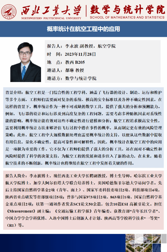 为深入贯彻学校“总师”型人才培养理念,促进大学数学课程与工科专业的深度融合,推进国家一流课程建设与实践,提升拔尖创新人才培养的数学思维及工程创新能力,2023年11月28日,应k动漫 都琳教授邀请,航空学院李永波副教授在《概率论与数理统计H》课堂上讲授了题为《概率统计在航空工程中的应用》的分享报告,航空学院22级黄玉珊班和强基班的60余名学生参加了此次活动。