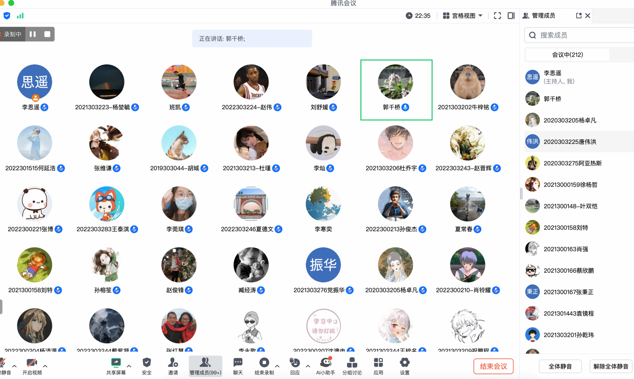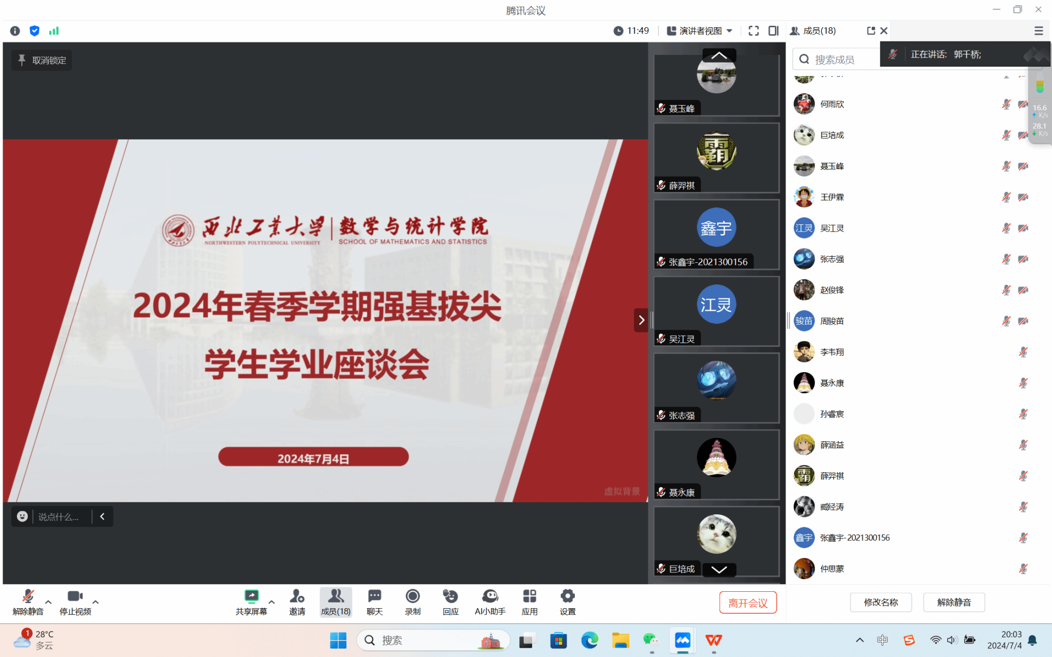为推进强基班人才培养,深入了解学生的思想与生活状态,收集他们对学院教育培养工作的反馈,不断优化人才培养体系。2024年7月4日晚20:00,k动漫 线上举行了2023-2024学年春季学期末强基班与拔尖班学生座谈会。k动漫 院长聂玉峰、教学副院长郭千桥、21级强基班班主任臧江涛、22级强基班班主任梅钰、23级强基班班主任赵俊锋、强基班学生代表和拔尖班全体学生参加了本次会议。