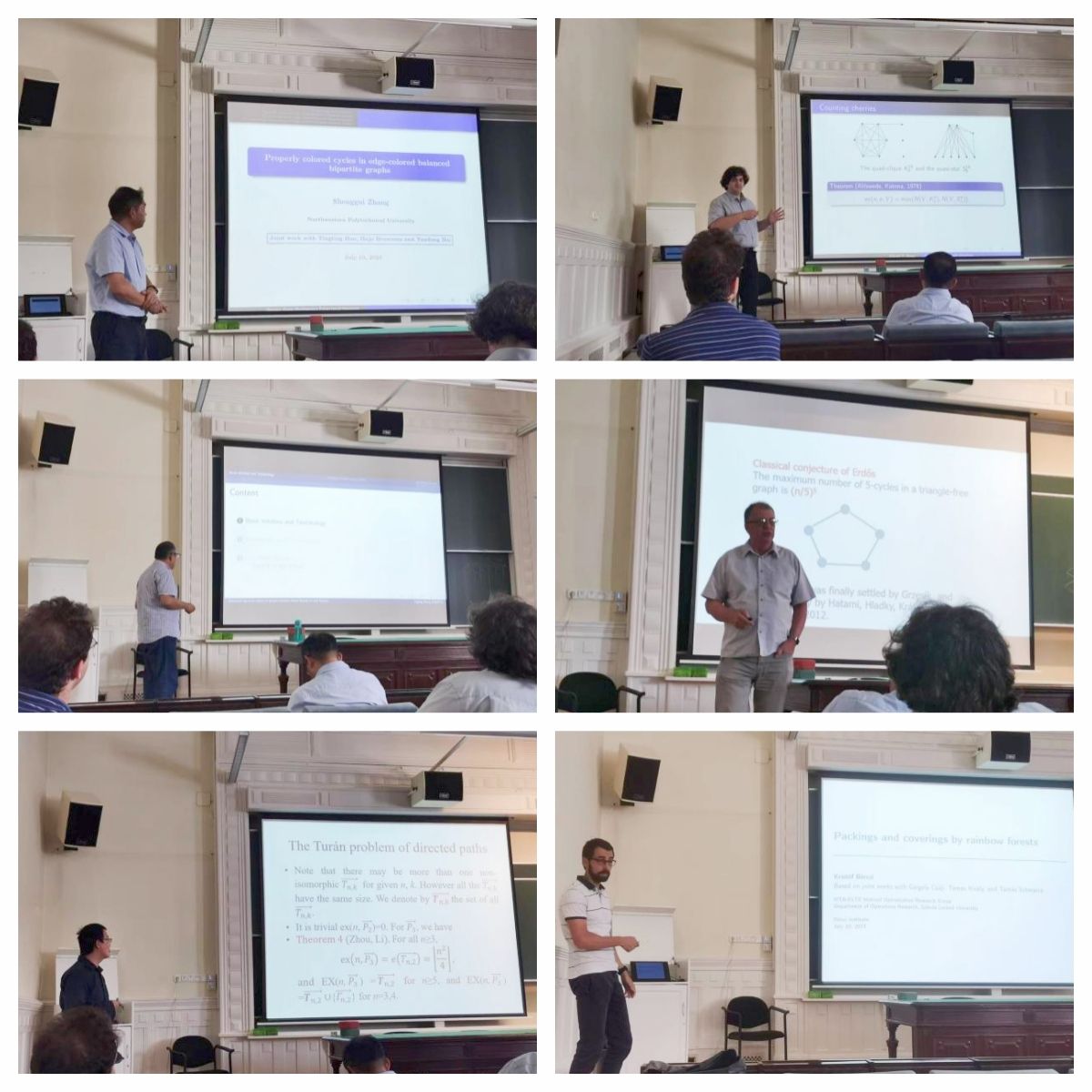 7月10日,由张胜贵教授和Katona院士组织的“中匈图论双边研讨会”在雷尼数学所学术报告厅成功举办。研讨会共有10场学术报告,包括5场我校教师的报告和5场匈牙利学者的报告。与会专家在着色图的子图存在性问题、图兰问题、子图密度问题等相关问题开展了分享与交流,研讨会现场气氛热烈。