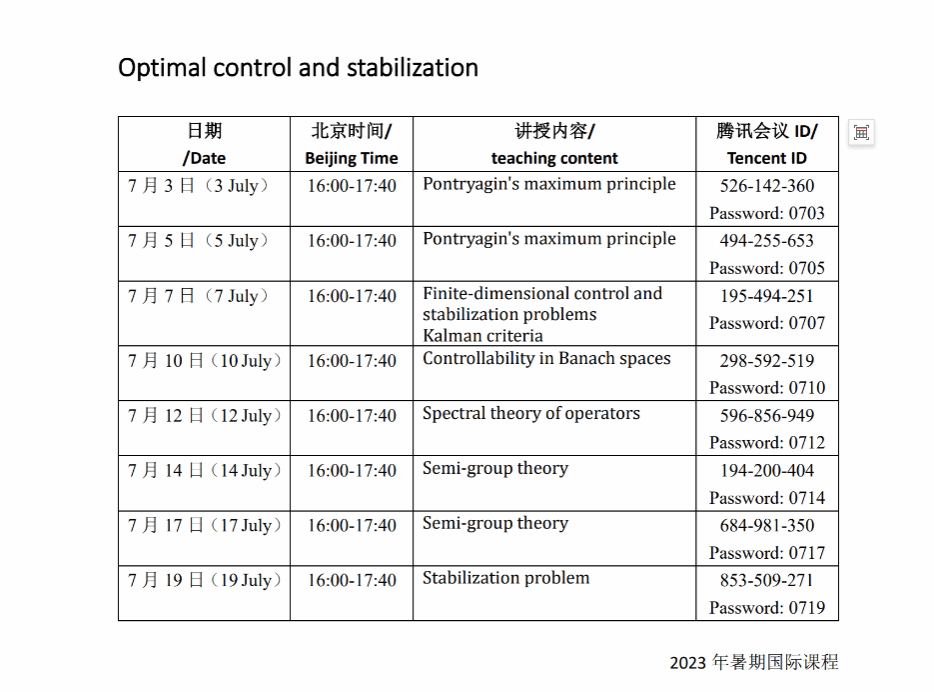该课程包括1学分16学时,以光滑动力系统的可控性和控制方法为主题,从外扰线性系统的形式解出发,到一般系统的控制器设计方法,严格讲述了最优控制问题的数学原理和应用技巧。课程内容分为8个专题,包括庞加辽金最值原理、卡尔曼定则、巴那赫空间上的可控性问题、算子的谱理论及算子半群方法等,最终解决动力系统中的预设目标稳定控制问题,是一门目的性强、信息量大的前沿应用方法课程。
