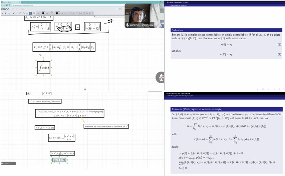 授课过程中,Gorshkov副教授由浅入深、循序渐进。以初等方法为原点,逐步引入现代数学方法。从学生角度出发,利用iDos等软件在线展示定理推导和证明过程。以问题引导学生思考,在互动中逐步描绘出理论框架的全部图景,使学生深刻感受了现代数学在控制领域的特色与发展潜力。