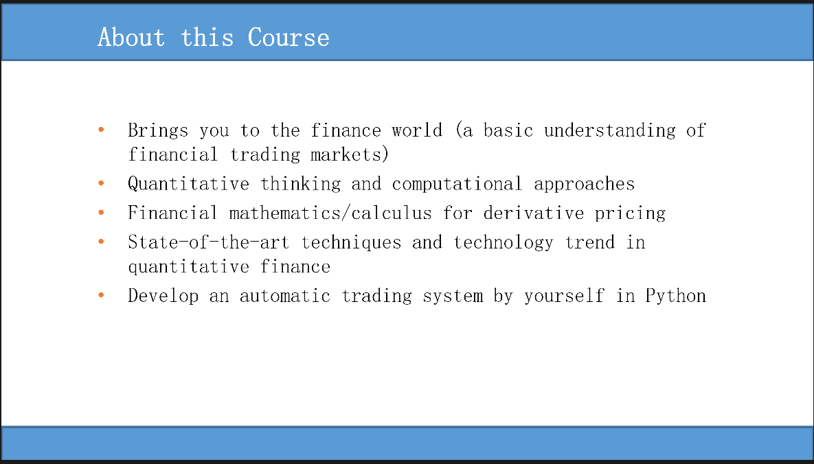本课程通过16个课时,向学生概要介绍了量化金融与计算金融的发展历程和研究方向(如图1-2)。商磊博士结合资深的求学与工作经历,为大家介绍了量化金融的基本概念(如图3)和产业现状,介绍数学和统计学在金融投资和交易领域中的重要应用,介绍当前主要的研究热点与研究机会,为我们描绘了未来发展的蓝图,让学生们更加了解自身学科的优越前景。