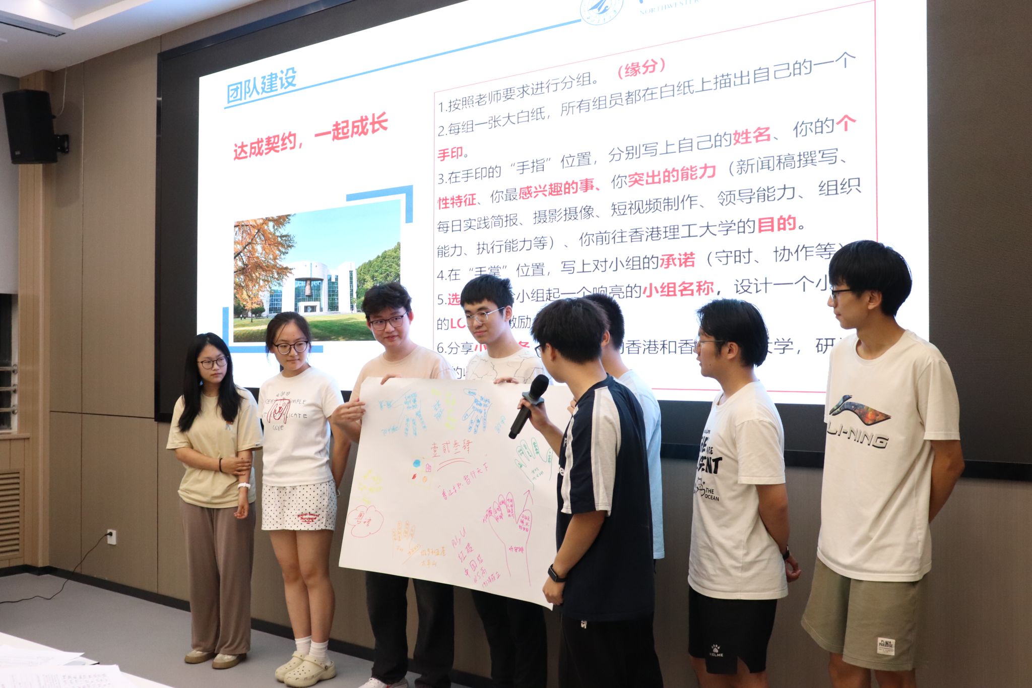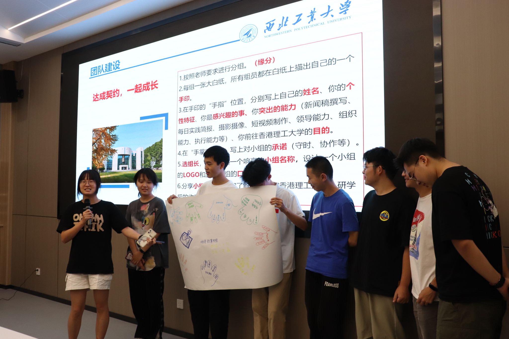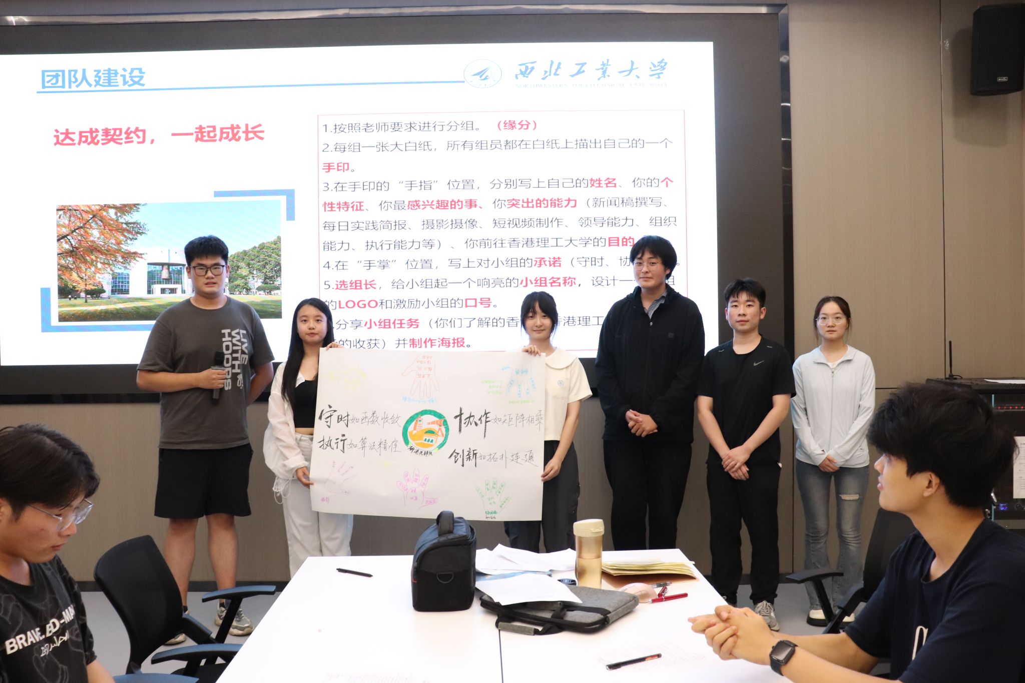 培训会上,王莉书记主要围绕团队意识培养展开核心培训,以“破冰行动”为切入点,带领学生开展团队建设。全体学生共分7个小组,依次完成“手印契约”绘制、小组文化设计等任务——各组成员在空白纸上描下手掌轮廓,于手指位置标注姓名、个性特征及专项技能,在掌心区域共同签署团队承诺。随后,各小组依次展示团队海报,介绍队名、LOGO及口号,并围绕 “香港文化认知”“研学预期收获”进行主题分享。“工大陆战队”“研港先锋队”等小组以海报与生动讲解赢得阵阵掌声,迅速凝聚团队共识,现场气氛热烈。