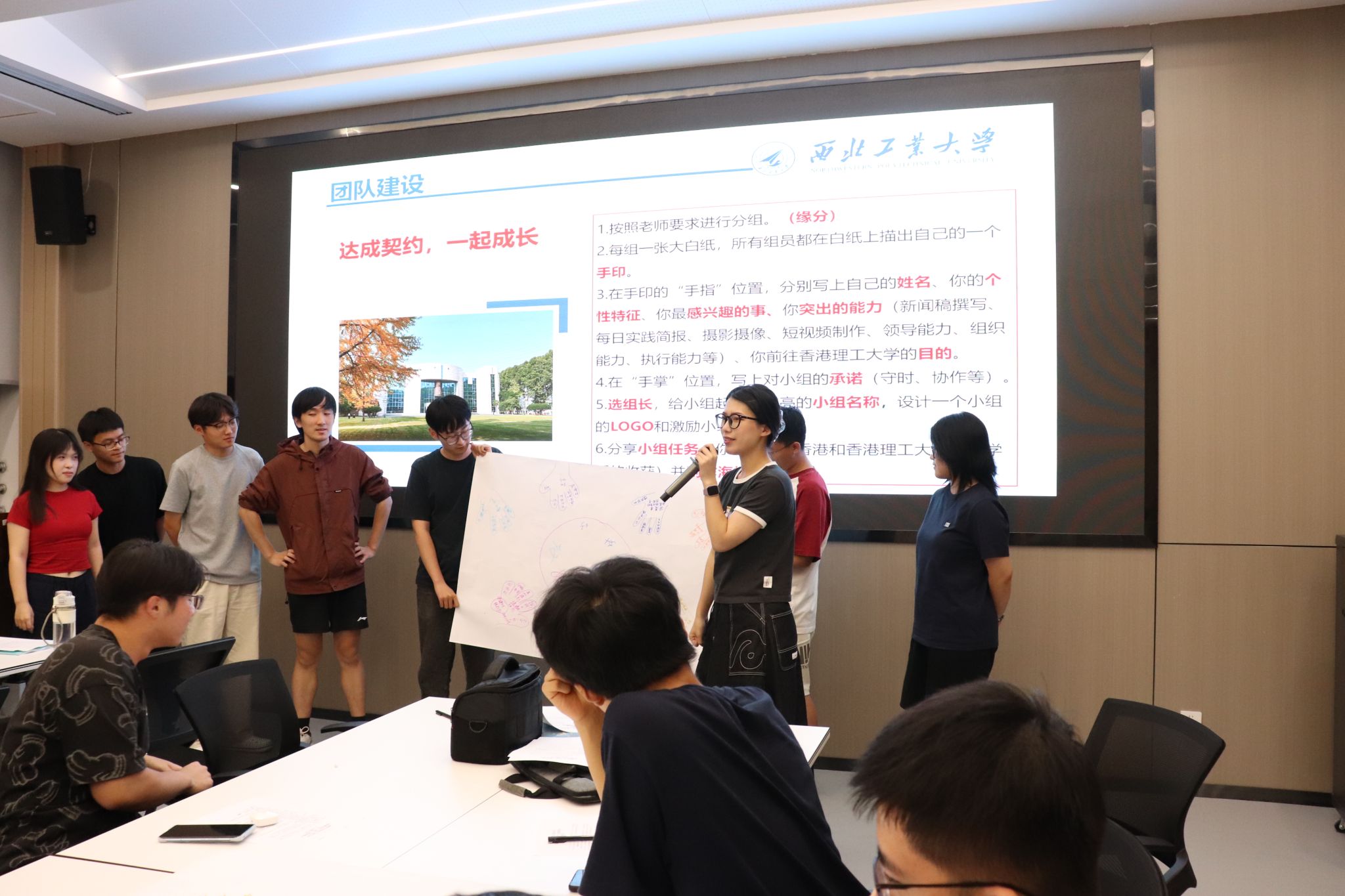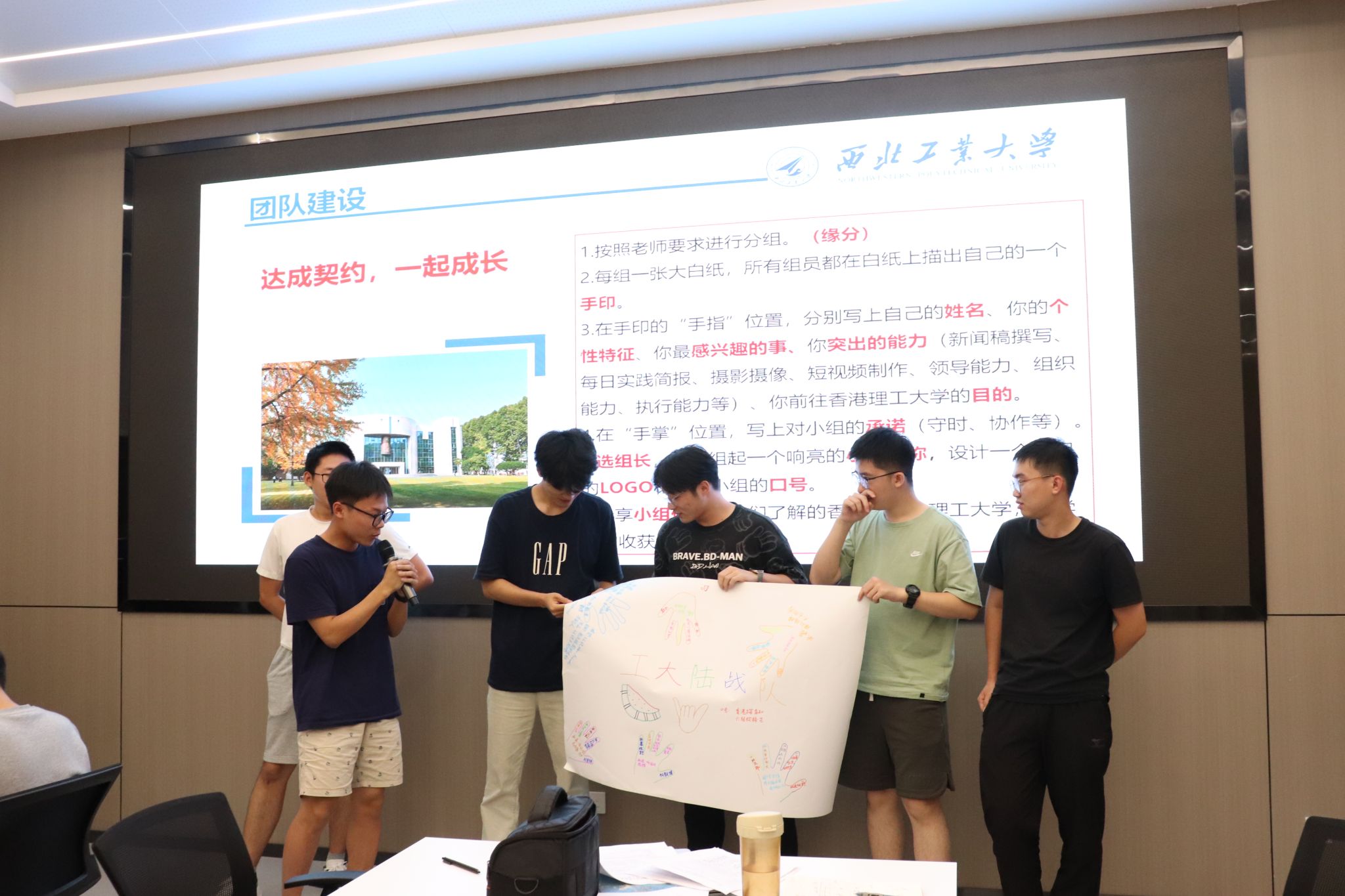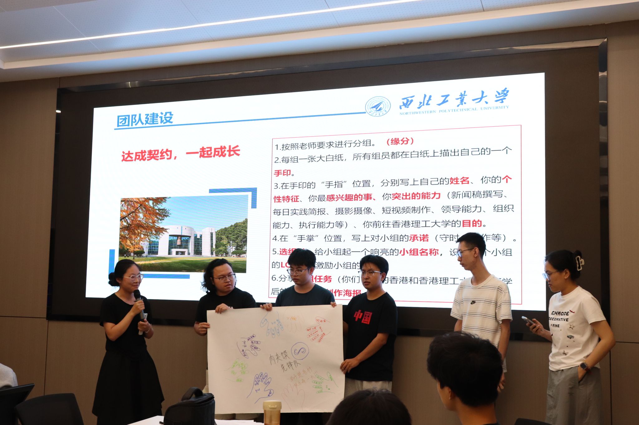培训会上,王莉书记主要围绕团队意识培养展开核心培训,以“破冰行动”为切入点,带领学生开展团队建设。全体学生共分7个小组,依次完成“手印契约”绘制、小组文化设计等任务——各组成员在空白纸上描下手掌轮廓,于手指位置标注姓名、个性特征及专项技能,在掌心区域共同签署团队承诺。随后,各小组依次展示团队海报,介绍队名、LOGO及口号,并围绕 “香港文化认知”“研学预期收获”进行主题分享。“工大陆战队”“研港先锋队”等小组以海报与生动讲解赢得阵阵掌声,迅速凝聚团队共识,现场气氛热烈。