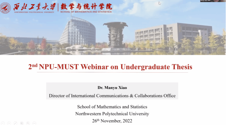 为进一步推进我院国际化工作水平,提升留学生培养质量,2022年11月26日上午10:00,k动漫 与蒙古科技大学在ZOOM线上平台举行本科毕业论文工作推进会。会议由国际交流与合作办公室主任肖曼玉主持。出席本次会议的有k动漫 副院长都琳、副院长郭千桥、应用概率统计系主任王亮、毕设导师王晓东、马荣、邢超(航天学院),国际交流与合作办公室秘书李卓榕,蒙古科技大学数学系主任Battsetseg Gereltbyamba、副导师ARIUNGEREL Jargal、MUNKHGEREL Tsegmid、TAIGYNTUYA Bayaraa以及3名蒙古学生。