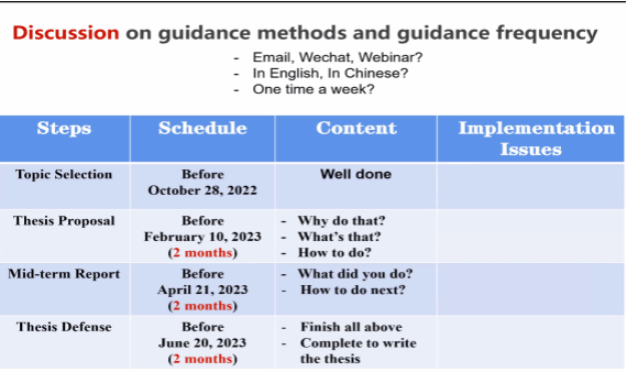 肖曼玉老师首先对蒙古学生的毕业选题情况作了简单介绍,并表示学校以及学院高度重视本科留学生的毕业论文工作,从论文选题、开题、中期考核、答辩,对导师和学生都有严格的阶段性要求。接下来双边导师分别从学术背景、研究方向和科研成果等方面做了自我介绍,并对学生提出了自己的指导要求。应用概率统计系主任王亮老师强调,学生和双边导师要注重指导过程中的交流和反馈,这是成功完成毕设的必要条件,离不开双方的共同努力。蒙古学生如在其中遇到任何困难,可随时联系中国导师或中国学生。最后,双方导师就毕业论文的指导方式和指导频率展开了具体讨论。
