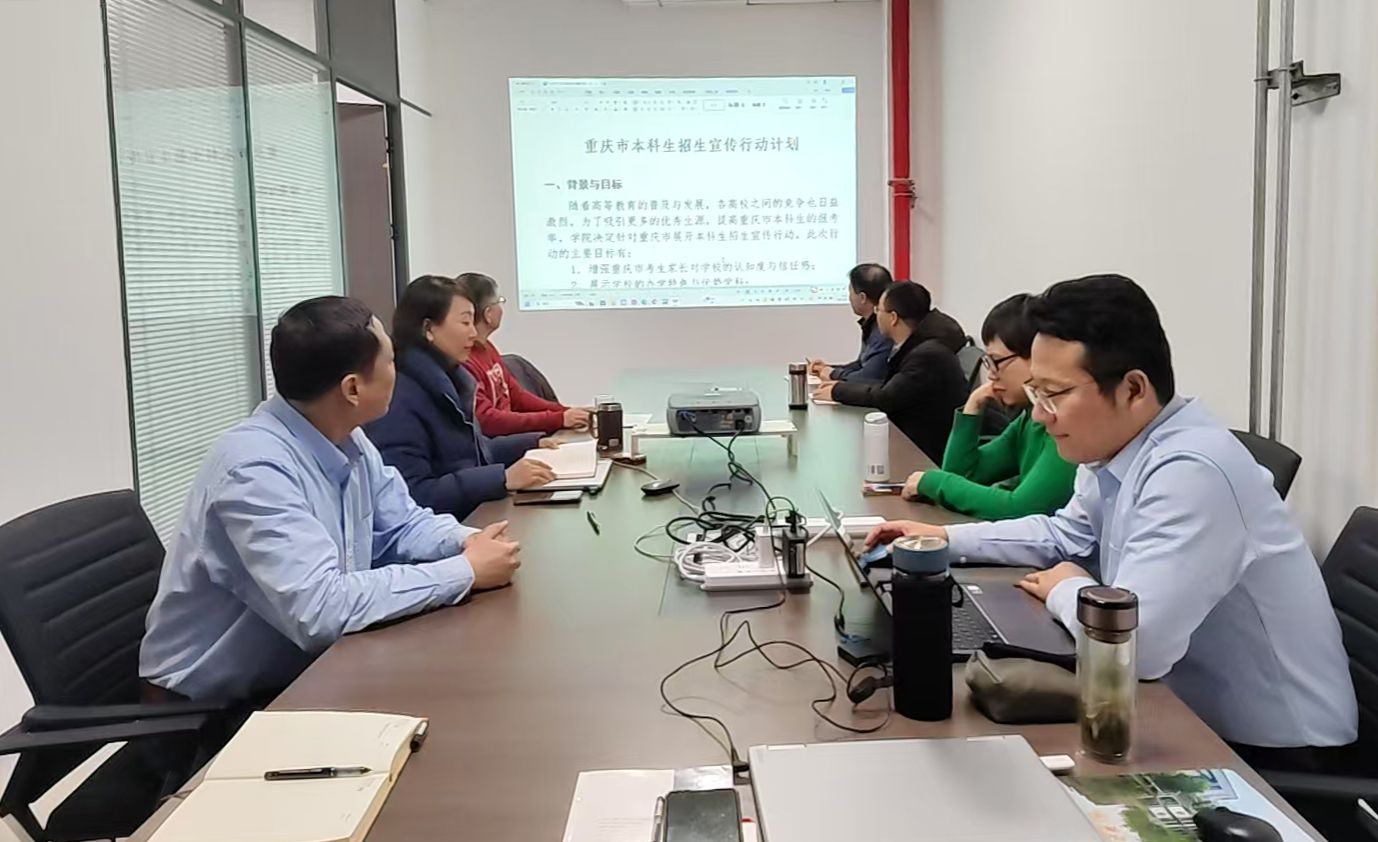 2025年3月5日下午,k动漫 在长安校区海天苑大楼E202召开2025年重庆市本科招生宣传工作会议。学院院长聂玉峰、党委书记王莉、副院长徐根玖、副院长郭千桥、院长助理刘晓刚、重庆招生组组长林伟、西安招生组组长王振海、招生秘书李彦吉参加会议。会议由郭千桥副院长主持。